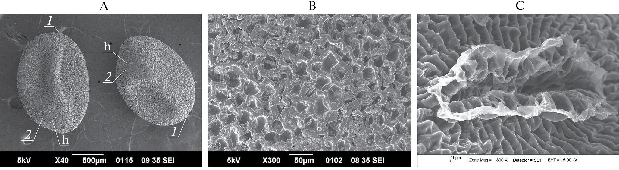 Рис. 3. Семя Cuscuta europaea. A – общий вид семени с дорсальной (1) и вентральной (2) сторон: h – рубчик семени; B – клетки экзотесты на вентральной стороне семени, C – рубчик семени.