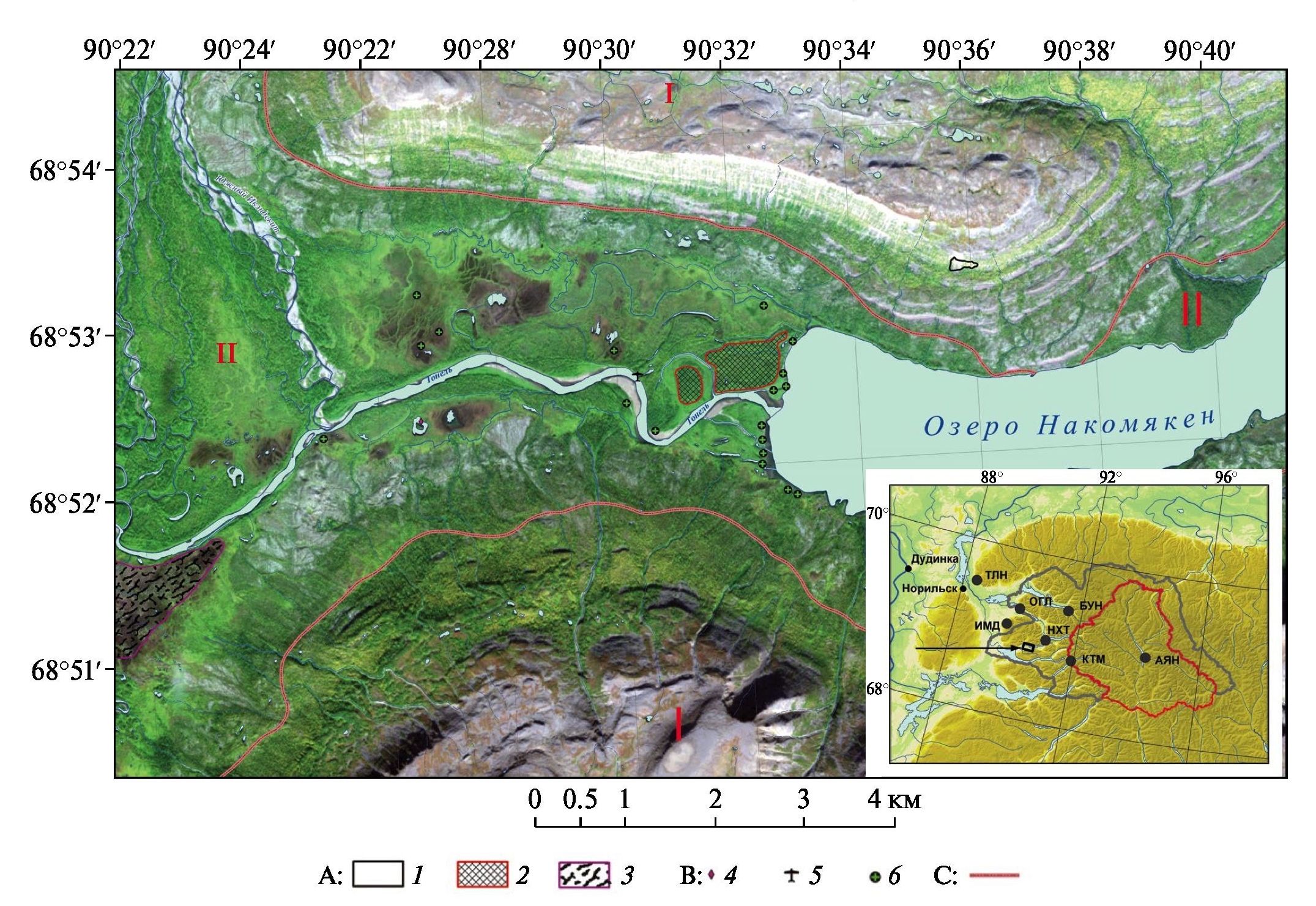 Среднегорья плато Путорана, расчлененные многочисленными разломами, сложенные базальтами, с высотами до 815 м над ур. м., с платообразными вершинами и крутыми расчлененными склонами. II. Межгорная котловина реки Тонель (Тон) – озера Накомякен, выполненная флювиогляциальными, аллювиальными и озерно-болотными отложениями, с высотами до 150 м над ур. м.