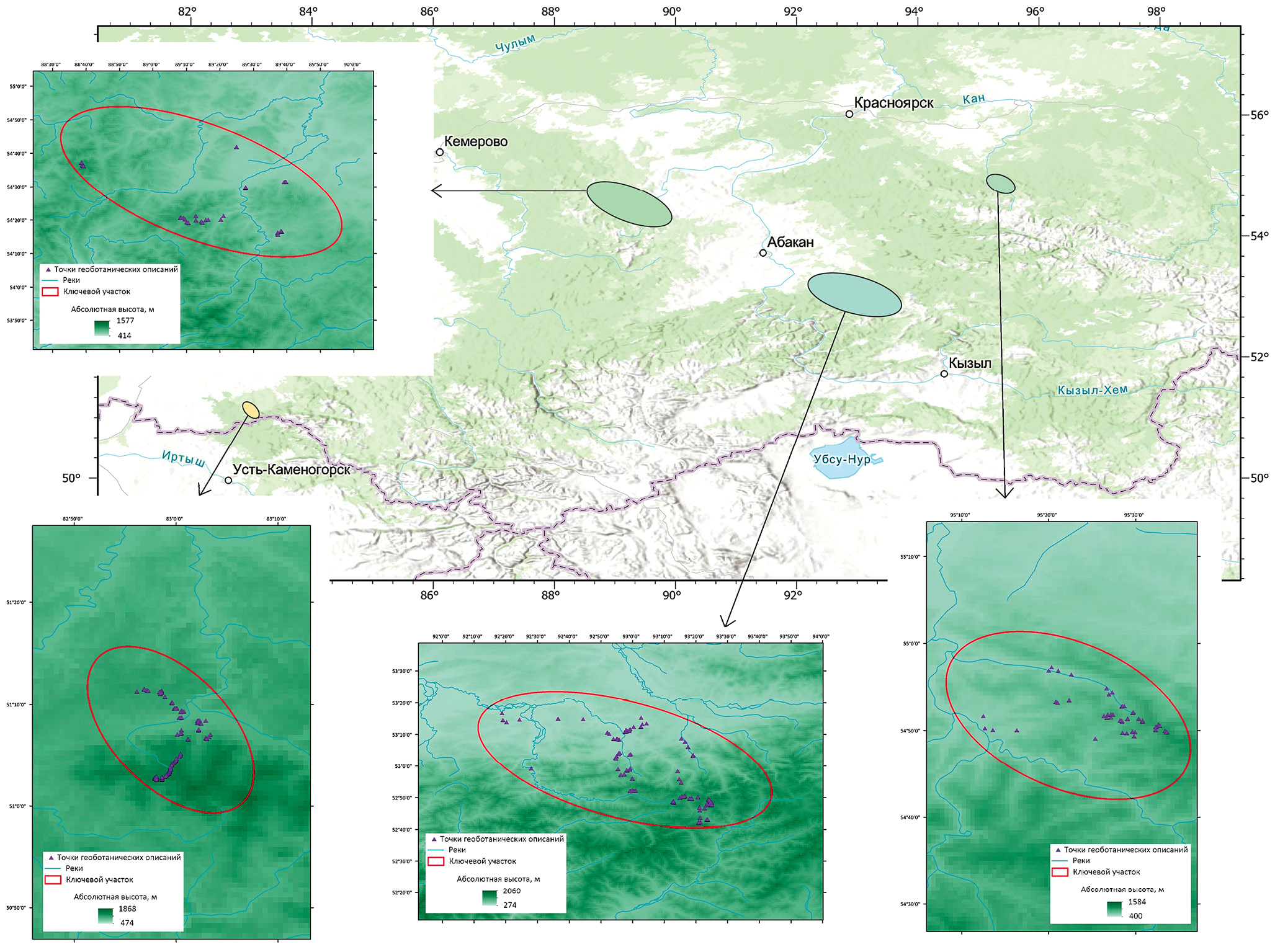 Для анализа выбраны 4 ключевые участка, характеризующие разнообразие типов поясности растительности оробиома. Ключевой участок в Западном Алтае расположен на северном макросклоне Тигирецкого хребта, на крутосклонных поверхностях которого выражена смена высотно-поясных подразделений при амплитуде высот от 500 до 1800 м над ур. м. Участок на восточном макросклоне Кузнецкого Алатау расположен в центральной части хребта на профиле от предгорного Черного озера до высокогорных Ивановских озер в пределах высот 400–1600 м над ур. м. Участок в Западном Саяне, занимающий наибольшую площадь, охватывает хребты Кулумыс, Кедранский, Ойский и Ергаки. Территория ключевого участка, большая часть которого приходится на бассейн реки Большой Кебеж, расположена на высотах 300–2000 м над ур. м. В Восточном Саяне ключевой участок приурочен к северному макросклону Саянского хребта в бассейне р. Кан (400–1600 м над ур. м.). Значительная высотная амплитуда, выраженная структура высотной поясности растительности с ее дифференциацией на разные типы позволяют на примере ключевых участков проследить региональную структуру формирования фитоценотического разнообразия оробиома в связи с климатическими условиями.