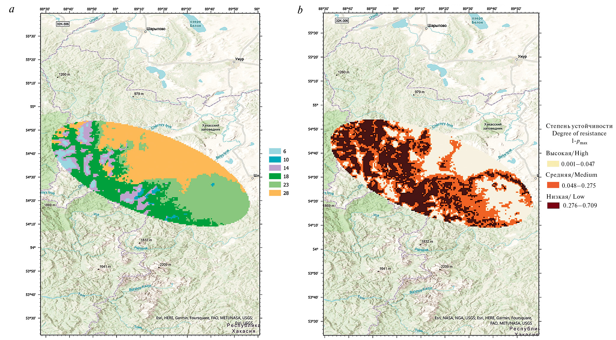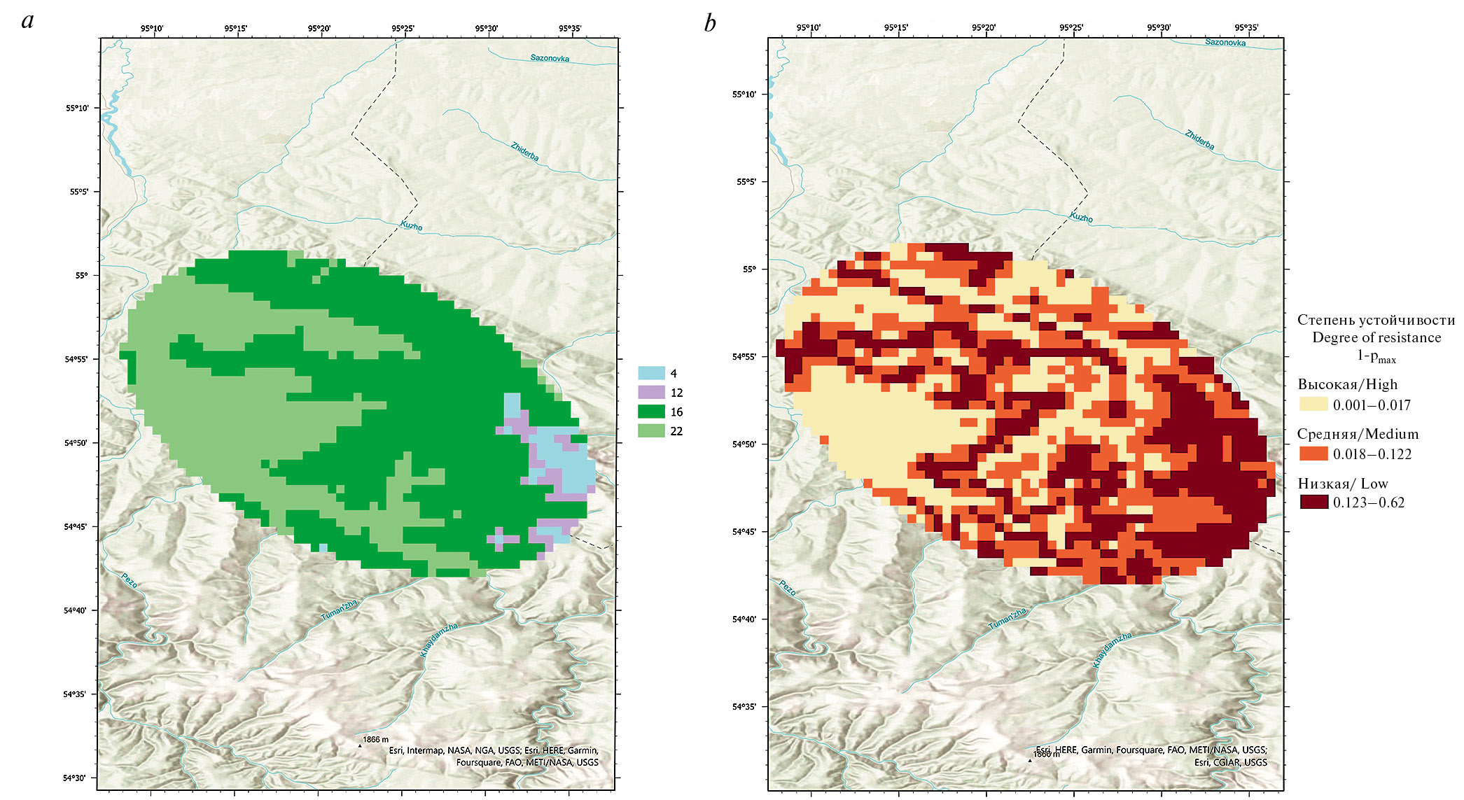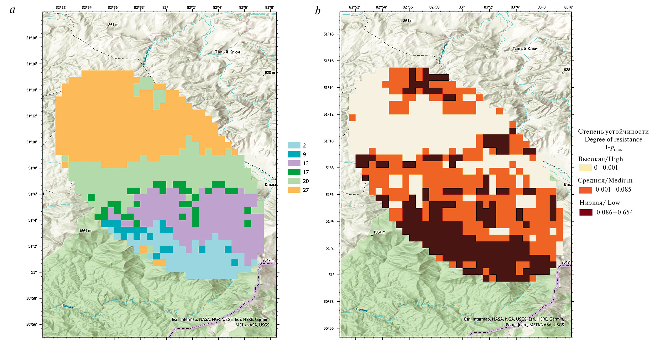 Более выровненный характер значений модельной вероятности характеризует большую степень неопределенности отнесения к классу, что может быть соотнесено с положением вне климатического оптимума, способствующим меньшей устойчивости к изменениям климата растительных сообществ и экосистем в целом. Наоборот, явно выраженный максимум для определенного типологического или высотно-поясного подразделения свидетельствует о развитии экосистем в оптимальных и близких к ним климатических условиях и потенциально большей устойчивости экосистем к их изменениям. Такой дифференцированный подход к оценке возможного отклика растительного покрова на изменения климатопов высотных поясов позволил определить высотно-поясные особенности потенциала развития экосистем с учетом региональной специфики оробиома. Для ранжирования потенциала современного состояния экосистем и их возможных трансформаций предложен показатель 1–pmax, где pmax является максимальным значением апостериорной вероятности соответствующего класса. С использованием способа выделения классов на основе квантилей выделены три ступени устойчивости: высокий, средний и низкий. Модельные показатели возможно использовать в качестве ориентиров, которые следует учитывать при прогнозе развития растительности, требующего обязательного анализа трансформации горных экосистем на основе специфики биотического компонента, его связей с абиотическими условиями и характера сукцессионного развития, инициированного климатогенными факторами.