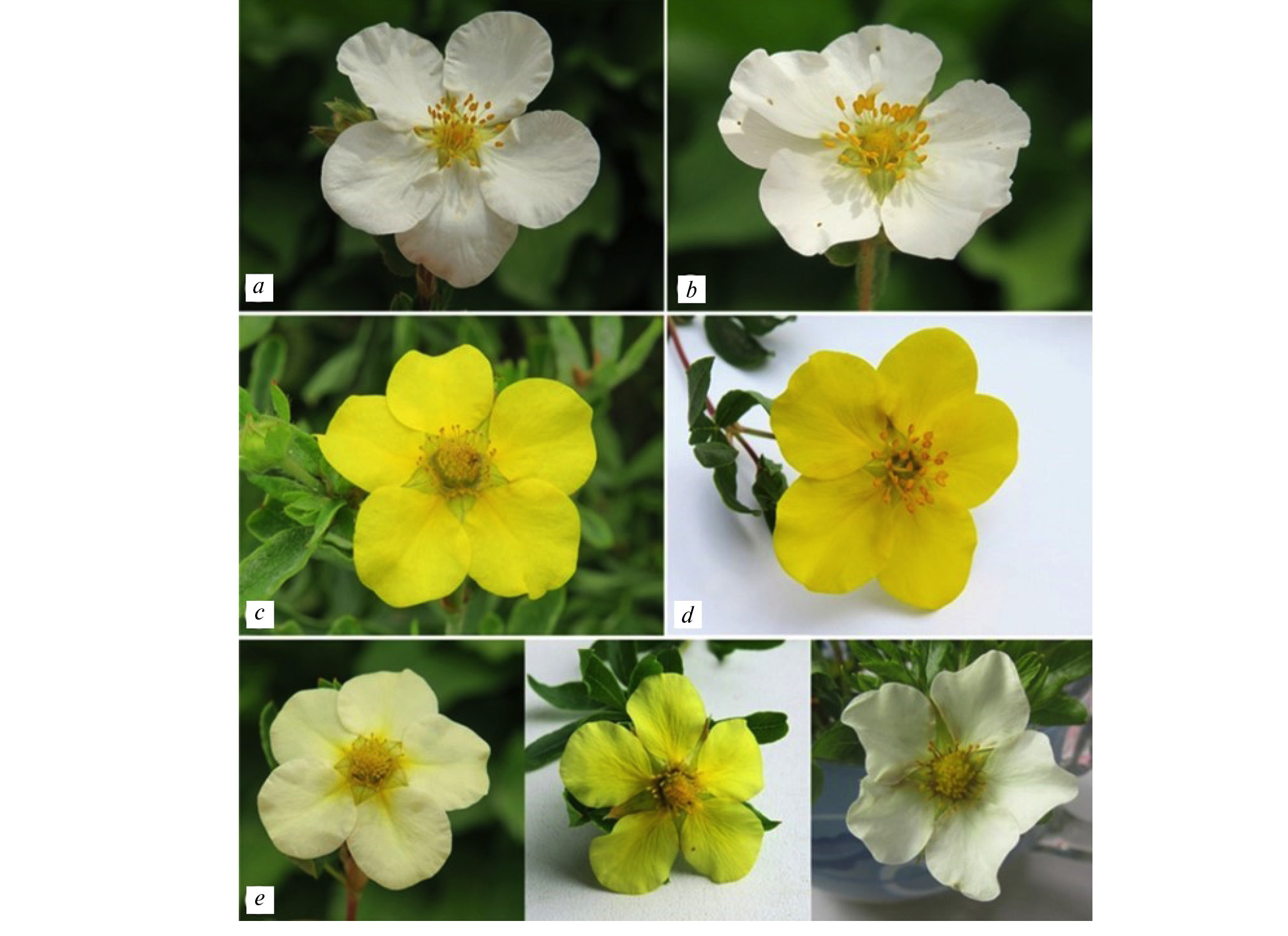 Fig. 1. Variability of the flower colour of the Dasiphora species: a – D. gorovoii , b – D. mandshurica , c – D. fruticosa , d – D. flava , e – D. davurica .