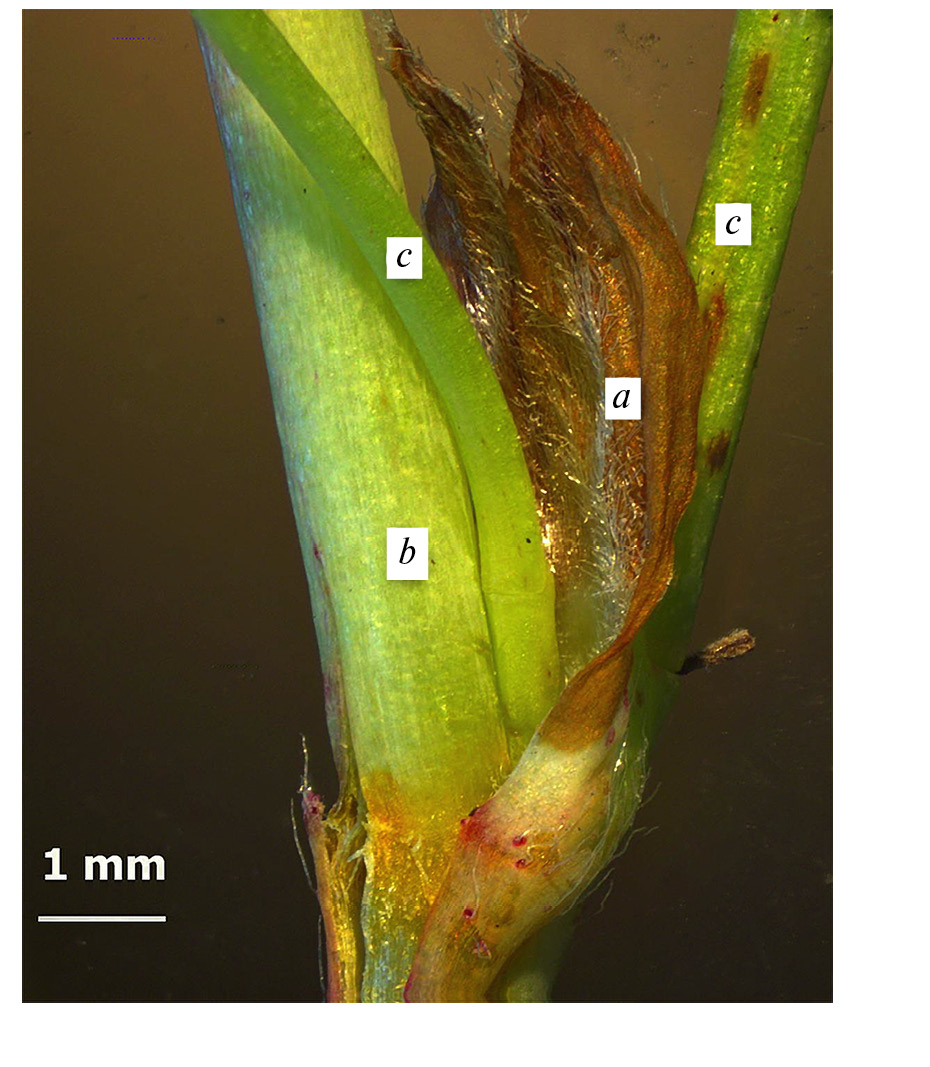 Рис. 2. Адаксиальная сторона прилистников Dasiphora flava : a – прилистник, b – стебель, c – черешок листа.