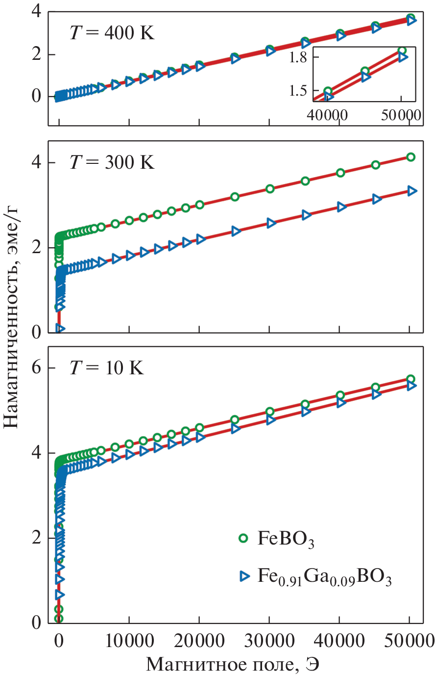 Highly perfect FeBO3 and Fe0.91Ga0.09BO3 single crystals were studied in a wide temperature range using SQUID magnetometry. A theoretical model describing the temperature and field dependences of the magnetization of single crystals has been developed. It is found that even a small concentration of gallium,