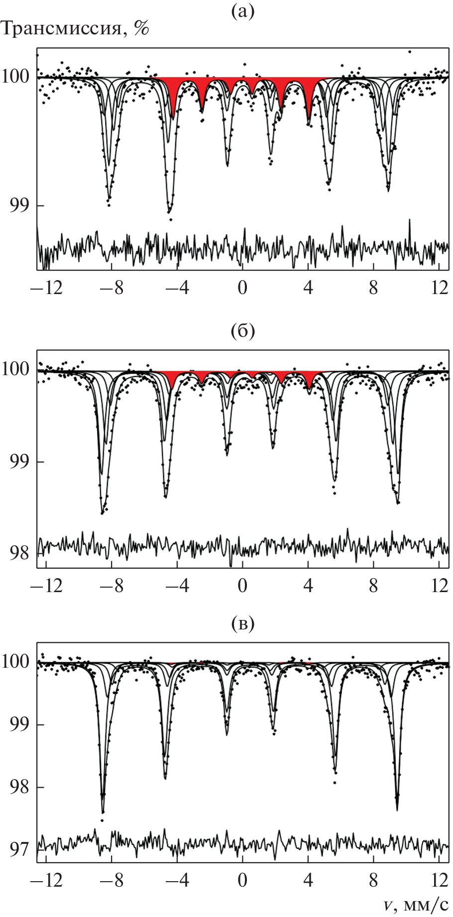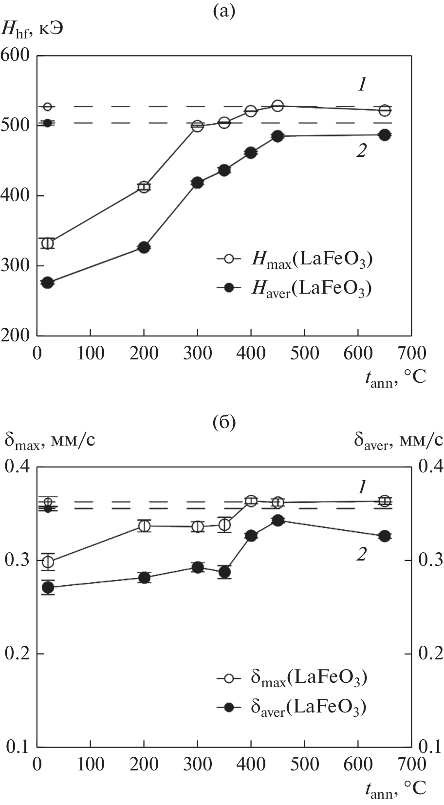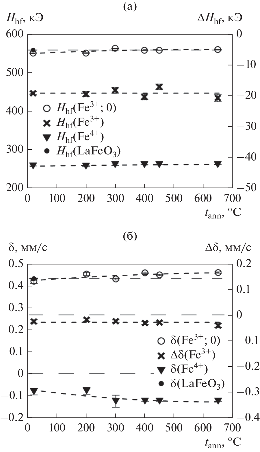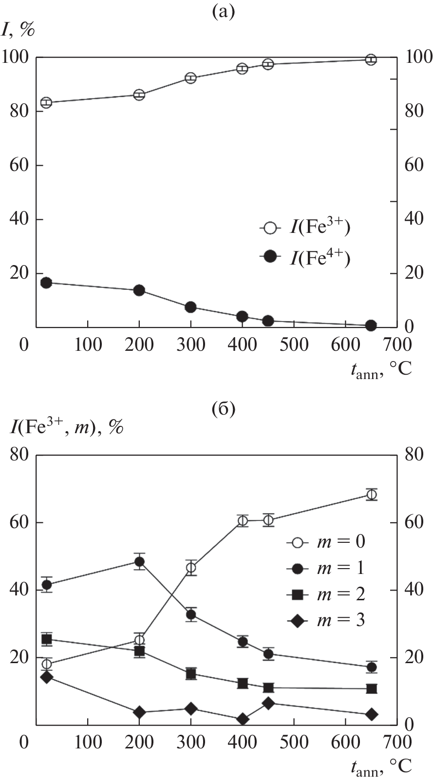 between Fe3+ and Fe4+. Upon vacuum annealing, as the temperature tann increased, the average hyperfine magnetic field on the 57Fe nuclei and the isomer shift of the spectrum increased, which is associated with an increase in the number of vacancies and, accordingly, a decrease in the amount of Fe4+. Mössbauer measure-ments at 85 K showed that the average valence state of iron does not manifest itself. The hyperfine parameters of the low-temperature Mössbauer subspectra obtained from the model interpretation indicate that one of them belongs to Fe4+ ions, and the rest belong to Fe3+. The presence in the spectra of several sextets related to Fe3+ ions is due to the appearance of oxygen vacancies (breaking of the Fe3+–O2––Fe exchange bond) and Fe4+ ions (weakening of the Fe3+–O2––Fe exchange bond) in the nearest ionic neighborhood of Fe atoms. Both factors cause a decrease in the hyperfine magnetic field and a change in the isomer shift of the spectrum. As a result of model interpretation of the Mössbauer spectra, the numbers of oxygen vacancies and Fe4+ ions per formula unit depending on vacuum annealing temperature tann were determined for all samples. It was