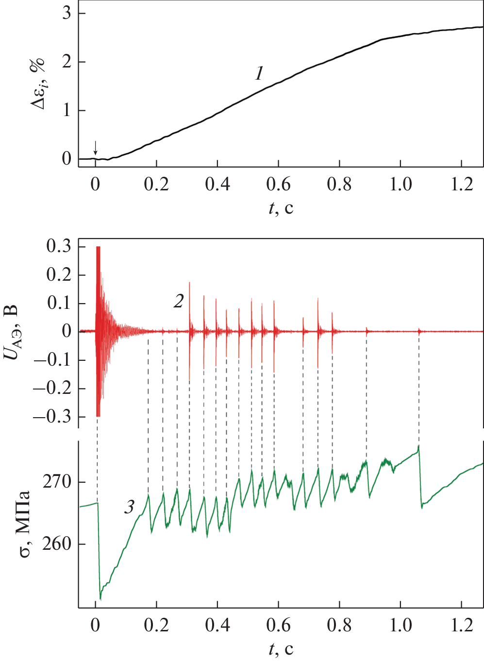 Зарождение и рост полос макролокализованной деформации, инициированных ударным индентированием деформируемых образцов алюминий-магниевого сплава, исследовали методом акустической эмиссии и высокоскоростной видеосъемкой с временным разрешением до 50 мкс. Установлено, что удар индентора вызывает развитие макроскачка пластической деформации амплитудой ~1–3%, обусловленного зарождением и распространением ~10 деформационных полос на поверхности сплава, демонстрирующего эффект Портевена–Ле Шателье. Показано, что полосы макролокализованной деформации представляют опасный вид эрозионного повреждения, который может вызвать внезапное разрушение сплава.