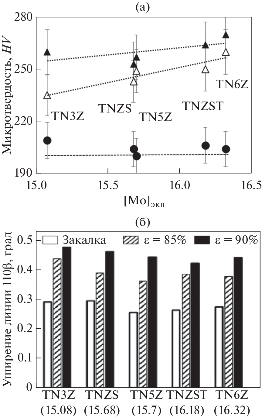 The influence of cold rolling with degrees of 85, 90% on the structural and textural state, microdurometric and elastic properties of hardened biocompatible -titanium alloys (at.%) Ti-26%Nb-3%Zr, Ti -26%Nb-5%Zr, Ti-26%Nb-6%Zr, Ti-26%Nb-3%Zr-1%Sn, Ti-26%Nb-3%Zr-1%Sn-0.7Ta . It is shown that an increase in the degree of deformation during cold rolling contributes to the formation of a more pronounced two-component texture {001}, {112} an increase in microhardness and a decrease in the values of the elastic modulus in the rolling plane . A good agreement between the calculated and experimental values of the modulus of elasticity of alloys in the quenched and cold-rolled states has been established.The influence of alloying and anisotropic state of alloys (through the molybdenum equivalent and the Zener anisotropy factor, respectively) on the level of their microhardness, contact modulus of elasticity E, including the difference in E in different sections of a cold-rolled sheet, is considered. It has been established that the minimum average value of Е=51±2 GPa in the rolling plane is given by the Ti-26Nb-3Zr alloy rolled with ε=90%, and the minimum level of average values Е (52±2 GPa in the rolling plane and 62±1 GPa in cross section) is typical for the Ti-26Nb-3Zr-1Sn alloy after rolling with ε= 85%
