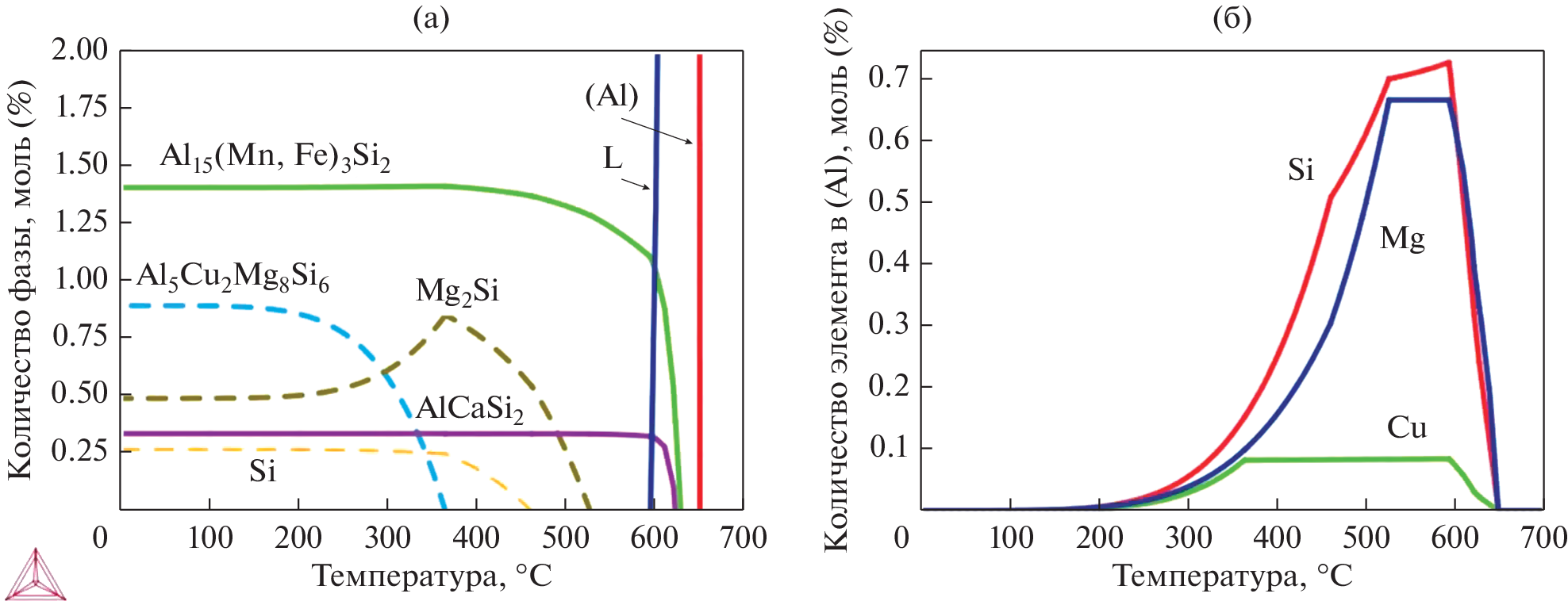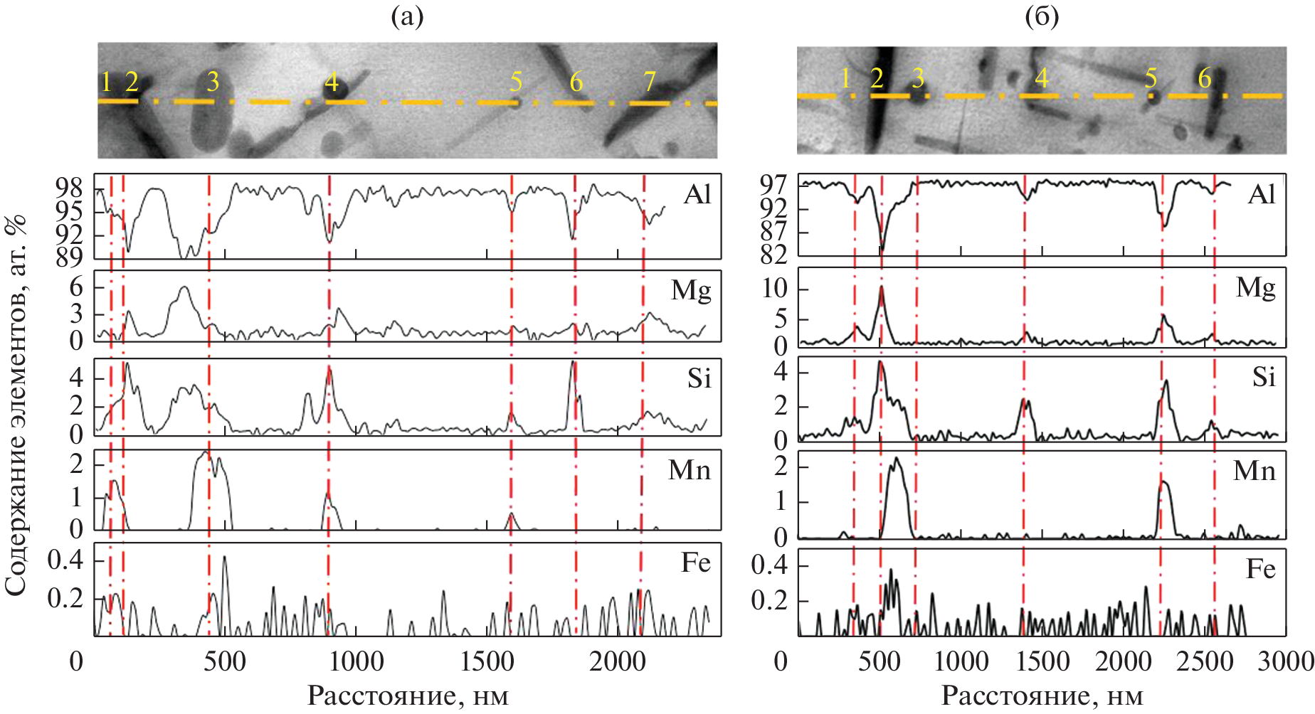 This paper presents the results of a study of the stability of a supersaturated solid solution (SSS) of sheets made of thermally hardened aluminum alloy of the Al-Mg-Si system with a small addition of copper (Al-0.6Mg-1.0Si-0.2Cu) under various quenching modes. The samples were subjected to isothermal or continuous quenching with different quenching cooling rates, after which artificial aging was carried out at a temperature of 170°C. From the results of thermodynamic modeling of the equilibrium phase composition of the alloy, it was found that for the temperature range from 300 to 530°C, the presence of the β-phase (Mg2Si) is most likely. With the use of transmission electron microscopy and X-ray spectral microanalysis, it was found that during quenching, the decomposition of SSS leads to the precipitation of undesirable large particles of metastable β-type phases or equilibrium β-phase. The nucleation of the secretions is realized in the form of rod-shaped particles by a heterogeneous mechanism mainly on the surface of the α-phase dispersoids (Al15(Mn,Fe)3Si2), which thus significantly increase the quenching sensitivity of the alloy. The formation of these secretions at a low quenching rate causes, during subsequent aging, a decrease in the proportion and density of formation of strengthening particles of the β" phase, and also leads to an increase in their size and heterogeneity of distribution in the aluminum matrix, which reduces the potential of dispersion hardening during aging and corrosion resistance of the material.