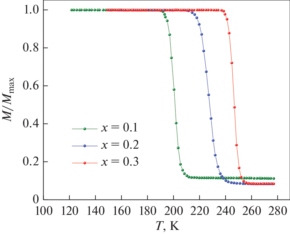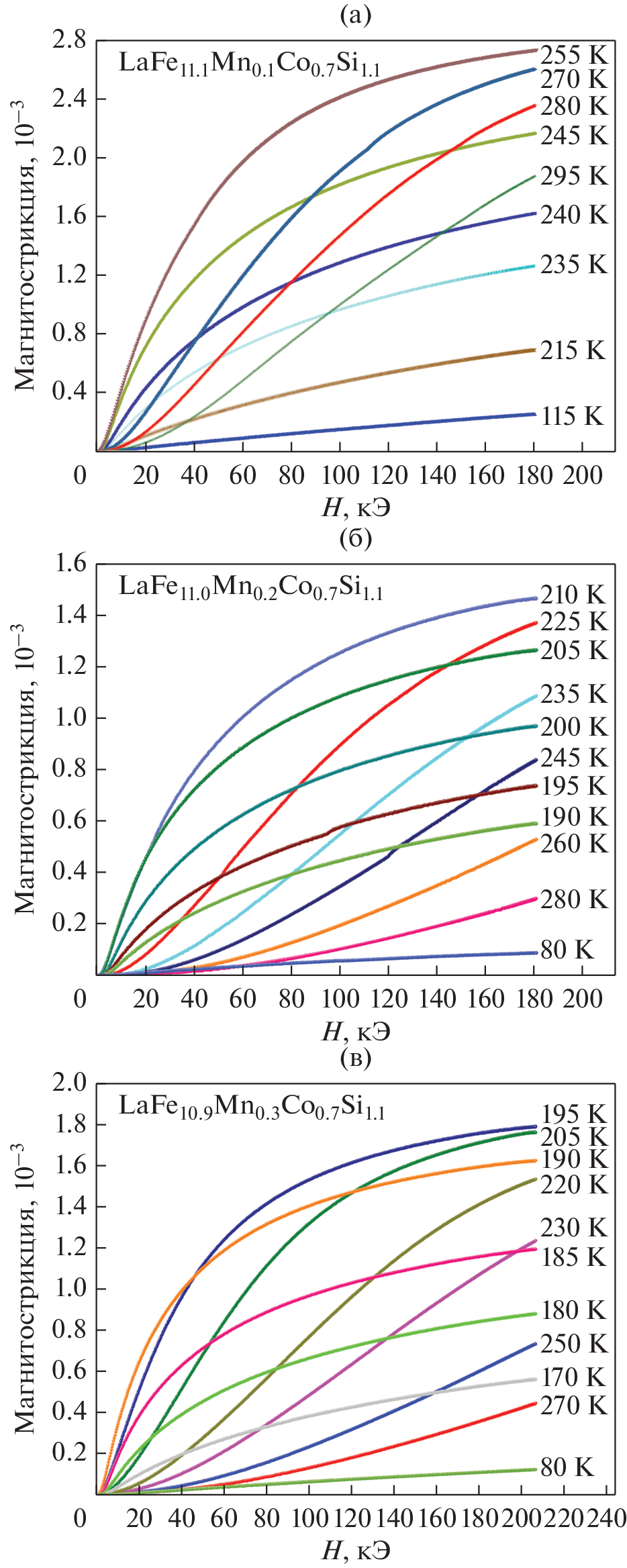 Измерены намагниченность и магнитострикция поликристаллических сплавов LaFe11.2 – хMnxCo0.7Si1.1 (x = 0.1, 0.2, 0.3) в импульсных магнитных полях до 180 кЭ в интервале температур 80–270 К. Замещение атомов Fe атомами Mn сдвигает ТС в сторону низких температур и не сказывается на величине намагниченности насыщения. Наблюдаемая полевая зависимость намагниченности M(H) вблизи ТС характерна для фазовых переходов второго рода, в то время как температурная зависимость намагниченности M(Т) выше ТС в сильных магнитных полях указывает на магнитный фазовый переход первого рода. Магнитообъемный эффект ∆V/V достигает 0.81% в поле 180 кЭ. Асимметрия магнитострикции относительно температуры максимума эффекта, проявляющаяся в сильных магнитных полях, и магнитополевой гистерезис магнитострикции носят признаки фазового перехода первого рода.