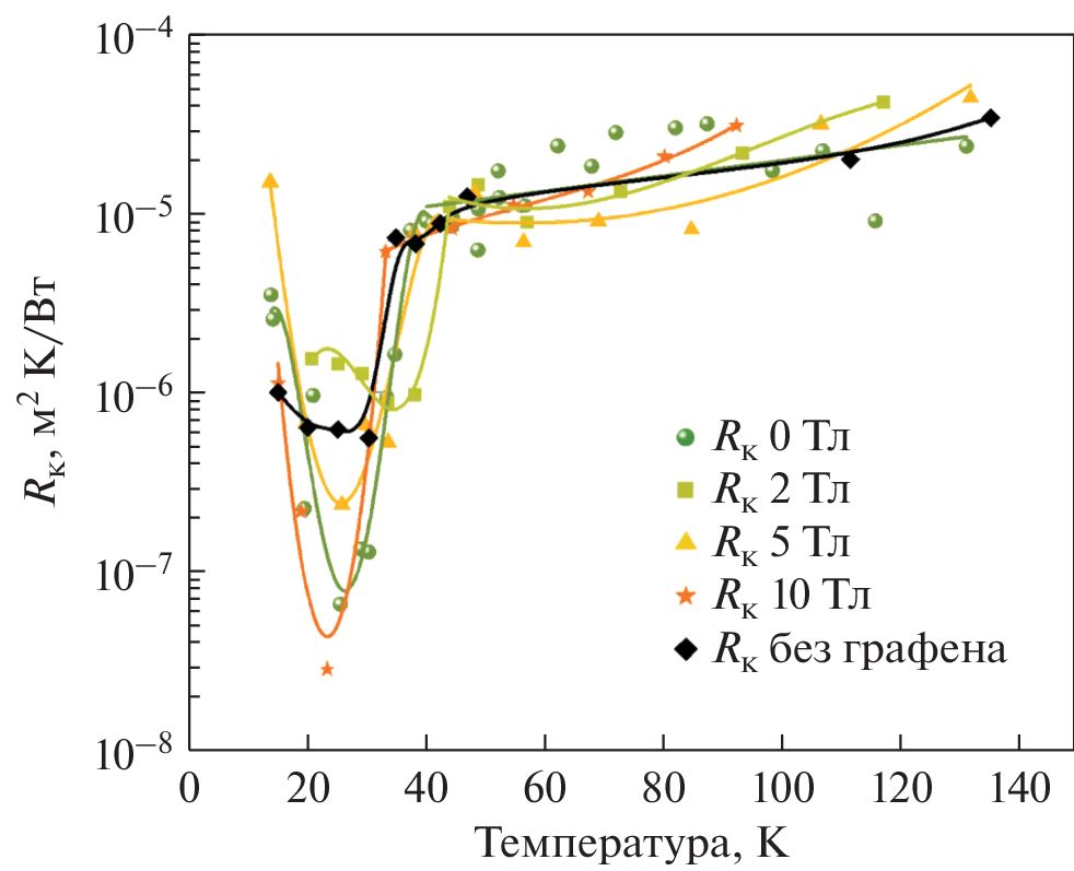 The thermal contact resistance of a detachable connection in copper-copper contact pair with a thermal interface from layers of graphene synthesized by the method of a low pressure chemical vapor deposi-tion on the contact surface was studied. Obtaining the value of the thermal contact resistance of a detachable contact pair copper–graphene–copper by the method of transient heat flow, at a temperature of 15–150 K under the influence of an external magnetic field up to 10 T.