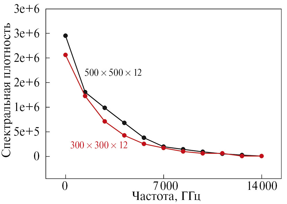 Проведен расчет изменения амплитуды спектральной плотности мощности при намагничивании образца. Вместе со смещением частоты в высокочастотную область происходит плавное уменьшение амплитуды вплоть до точки насыщения образца. При этом кривые для пленок больших поперечных размеров оказываются выше (рис. 5).