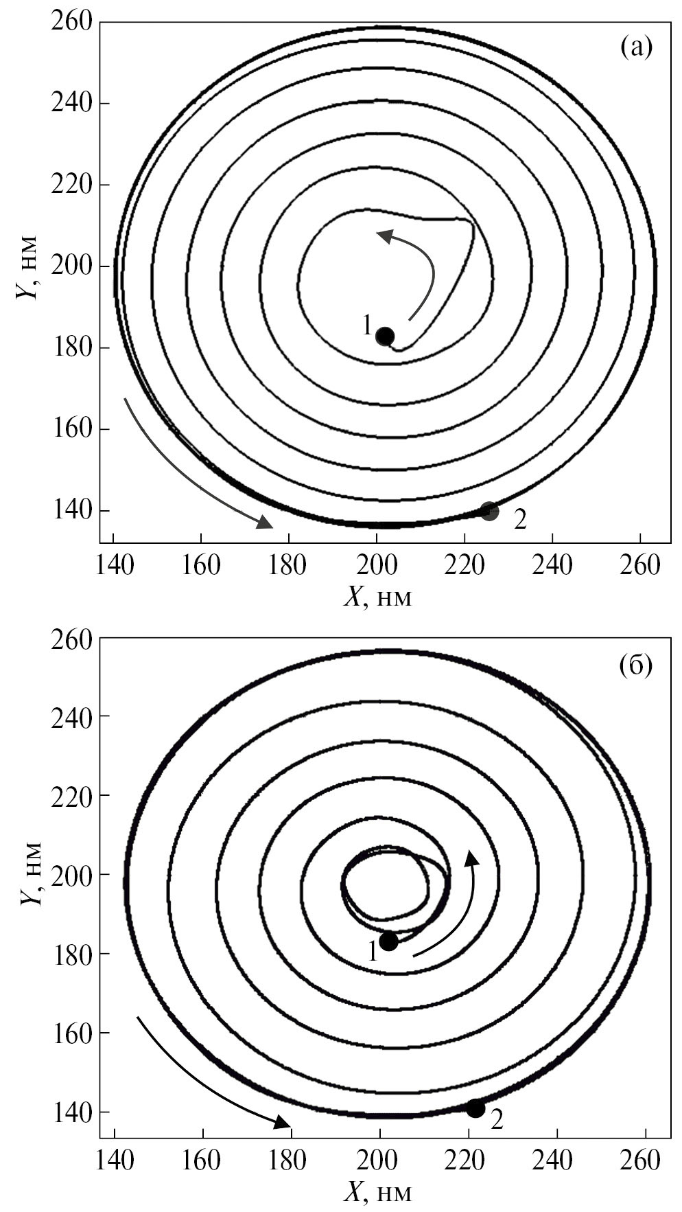 Численный эксперимент заключался в следующем. В начальный момент имеем два вихря одинаковой полярности и киральности. Затем включаем спин-поляризованный ток и изучаем связанную динамику вихрей. На рис. 1 показаны траектории движения координат центров вихрей в толстом и тонком магнитных слоях при плотности тока j = 20×10⁷ А/см². Из рисунков видно, что вихрь выходит из центра (точка 1) и некоторое время движется по кривой. Далее вихрь начинает двигаться с ускорением по спирали против часовой стрелки и выходит на стационарную орбиту, где движение происходит с постоянным радиусом и частотой. Точки 1 (момент времени 0 нс) и 2 (момент времени 10 нс) соответствуют начальному и конечному положению вихря на диске. При данной величине тока режим П-вихрей не меняется. Вихри располагаются при движении практически друг под другом и радиусы их траекторий отличаются на единицы нанометров.