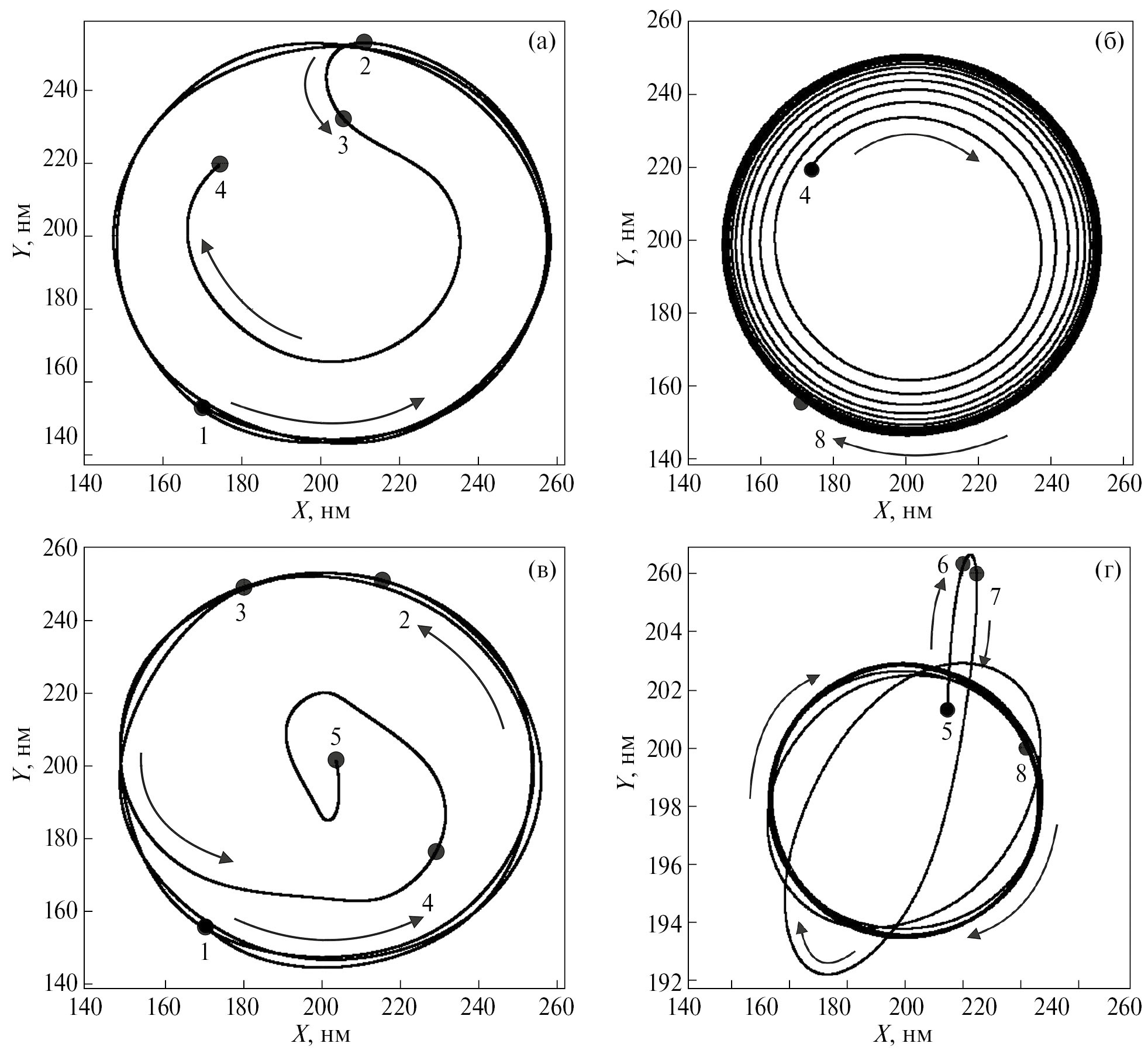 Рис. 3. Траектория движения вихря при плотности тока j = 26×10⁷ А/см² в толстом (а, б) и тонком слоях (в, г). (а) точка 1 – 12 нс, точка 2 – 14,3 нс, точка 3 – 14,4 нс, точка 4 – 15 нс. Точки 2 и 3 соответствуют моменту переключения, (б) продолжение траектории вихря рис. 2а, здесь видно, как вихрь выходит на стационарный режим после переключения полярности. Точка 4 – 15 нс, точка 8 – 25 нс; в тонком слое (в, г) траектория движения вихря при плотности тока j = 26×10⁷ А/см². Точка 1 – 12 нс, точка 2 – 14,3 нс, точка 3 – 14,4 нс, точка 4 – 15 нс, точка 5 – 16 нс, точка 6 – 16,1 нс, точка 7 – 16,2 нс, точка 8 – 25 нс.