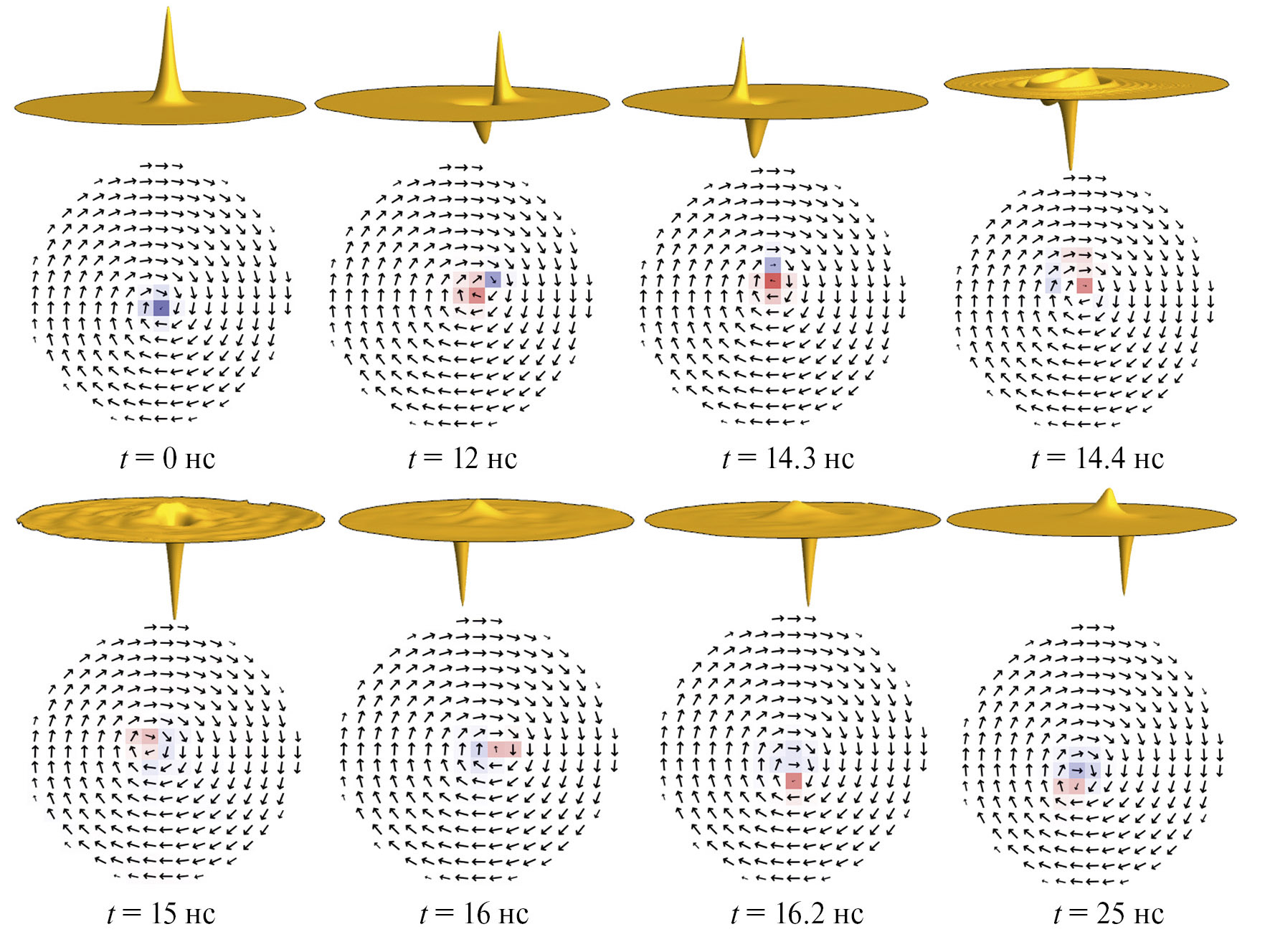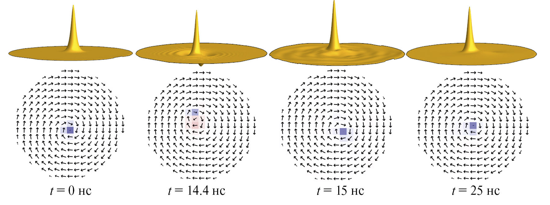 В момент переключения старый вихрь аннигилирует с новым антивихрем и остается новый вихрь с противоположной полярностью. Переключение происходит с излучением спиновых волн. Далее видно, что по истечении некоторого времени излучение заканчивается и новый вихрь выходит на новую стационарную орбиту с новым радиусом и частотой. В данном случае структура нового вихря более сложная, чем первоначальная. Она содержит “провал” намагниченности рядом с ядром вихря.