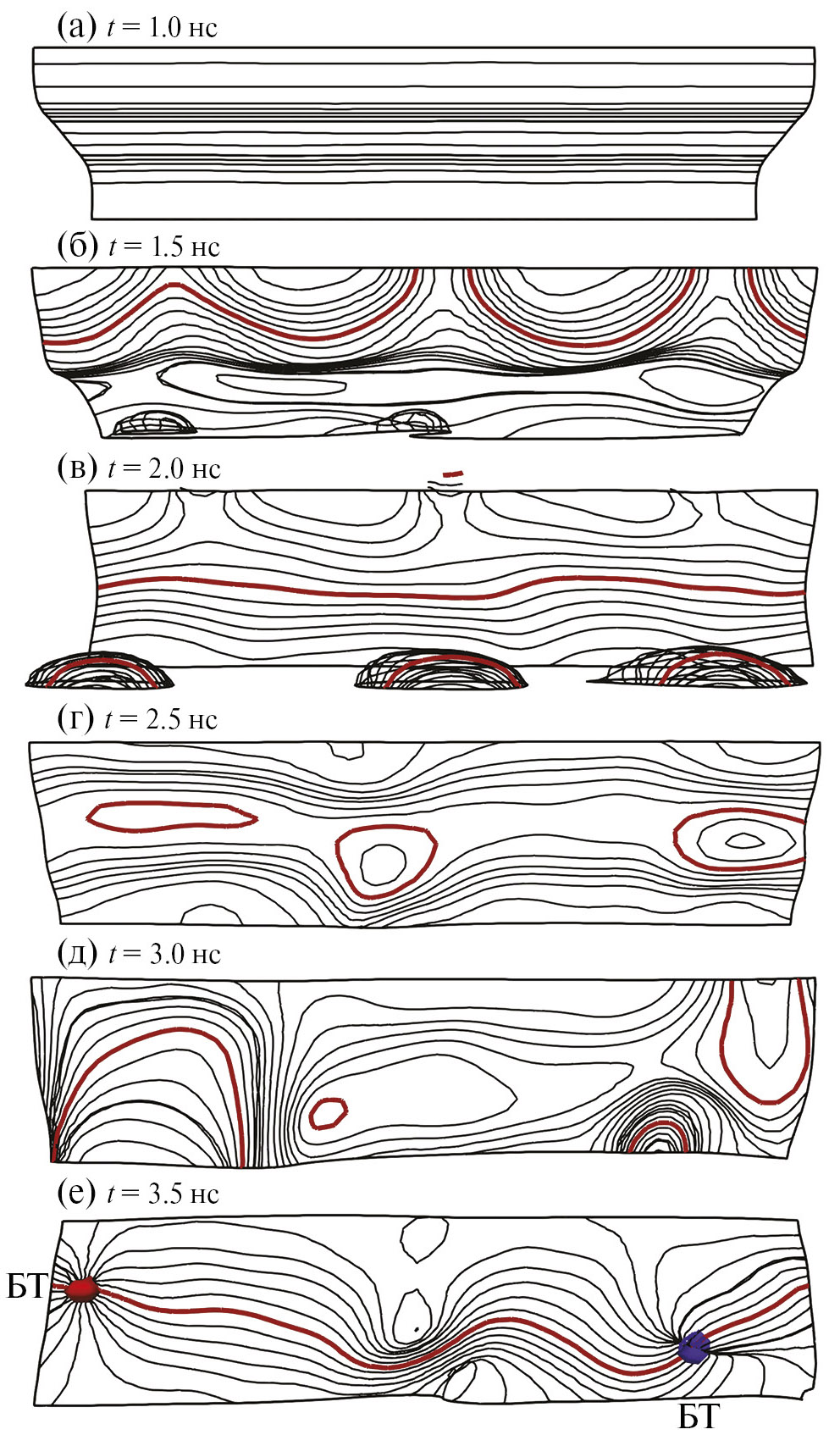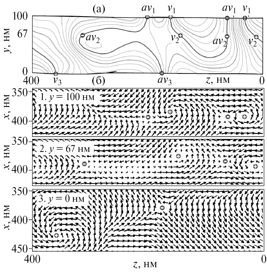 Проиллюстрируем сказанное выше, рассматривая частный случай конфигурации намагниченности. На рис. 6а изображен моментальный снимок yz-проекции поверхности ℚ и лежащих на ней КП в момент времени t = 2.5 нс (случай пленки с линейным 1×3 массивом параллелепипедов, имеющих размеры d = 100 нм, h = 25 нм). На трех толстых (красных) кривых КП, каждая из которых имеет U‑образную форму, лежат центры вихрей, для которых векторы намагниченности m в этих центрах имеют направления оси y. Две кривые своими концами выходят на поверхность образца в точках, обозначенных v1 и находящихся на верхних гранях параллелепипедов; как следует из рис. 6в, в этих точках в плоскости y = 125 нм расположены вихри. Вторые концы U‑образных КП, находящихся в средней части образца, а также оба конца третьей U‑образной кривой, состоящей из двух фрагментов, выходят на верхнюю границу пленки y = 100 нм в точках v₂ и av₂ (напомним, что вдоль оси z наложено условие периодичности (2), вследствие чего распределения намагниченности в плоскостях z = 0 нм и 400 нм совпадают). Как следует из рис. 6б, на котором изображены xz-проекции поверхности ℚ и КП, а также из рис. 6в (нижняя часть), в точках v₂ и av₂ действительно имеются распределения типа вихрь и антивихрь. Замечено, что при появлении ЗП с объемной вихревой структурой такого типа процесс перемагничивания замедляется и может наступить полное прекращение движения ЗП.
