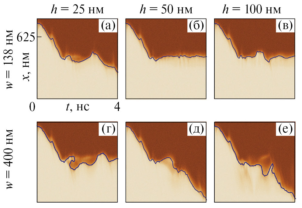 Рис. 2. Результаты моделирования для параллелепипедов с размерами h и w. Изображены зависимости от времени t и x-координаты величин m̅z, усредненных по yz-сечениям образца (тоновые изображения); x-координаты точек на поверхности mz = 0, имеющих фиксированные y и z-координаты (сплошные линии). Переход от светлого тона к темному соответствует повороту намагниченности от направления против поля Hₑₓₚ к направлению вдоль этого поля.