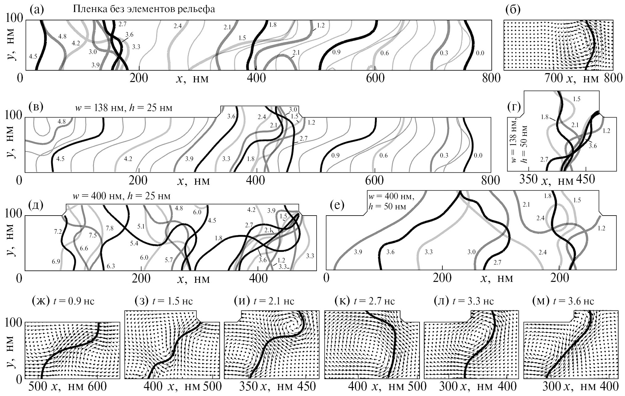 Рис. 3. Семейства проекций цилиндрических поверхностей ℚ на xy-плоскость в различные моменты времени для пленки без элементов рельефа (а); для пленки с рельефом в виде параллелепипеда, имеющего размеры w = 138 нм, h = 25 нм (в) и h = 50 нм (г); размеры w = 400 нм, h = 25 нм (д) и h = 50 нм (е). Графики проекций изображены с шагом по времени 0.3 нс (толстые линии с оцифровкой) (а, в–е); на участках быстрого движения ЗП добавлены графики с шагом 0.1 нс (тонкие линии без оцифровки) (а, в). Показана начальная конфигурация векторного поля m в xy-сечении, соответствующая С-образной ДС (б). Также для случая w = 138 нм, h = 25 нм показаны характерные конфигурации поля m в xy-сечениях, возникающие в различные моменты времени (ж–м). Близкие и перекрывающиеся жирные линии изображены разными оттенками серого цвета.