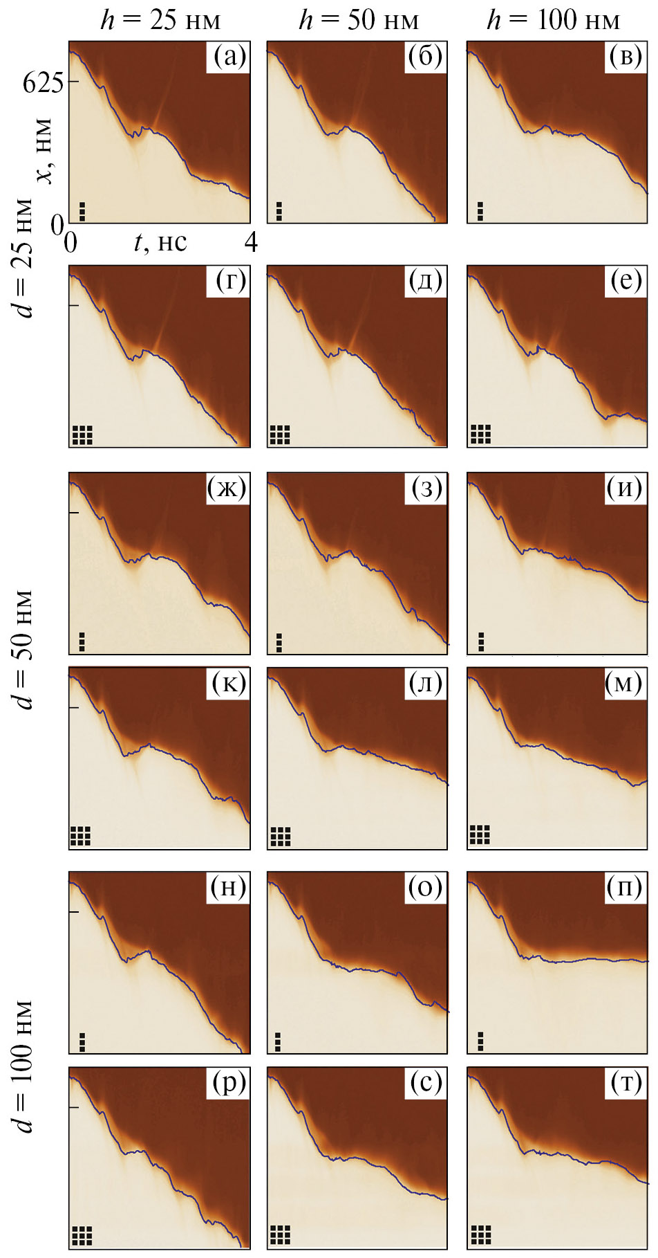 Анализируя динамические конфигурации намагниченности для различных геометрий, можно отметить отсутствие простых закономерностей, связывающих параметры параллелепипедов и скорости перемагничивания. При всех значениях d, если h = 25 нм, движение ЗП сопровождается изменением намагниченности в параллелепипедах, которая следует за намагниченностью в пленке. Перемагничивание происходит в этих случаях сходным образом (левый столбец на рис. 4). При h = 100 нм в параллелепипедах или в их частях, наиболее удаленных от пленки, формируются устойчивые закрепленные конфигурации намагниченности, не меняющиеся при движении ЗП (вихри с осями в направлении оси z; области, намагниченные вдоль оси y). Можно заметить, что именно в этих случаях скорость перемещения ЗП уменьшается или становится равной нулю (правый столбец на рис. 4).
