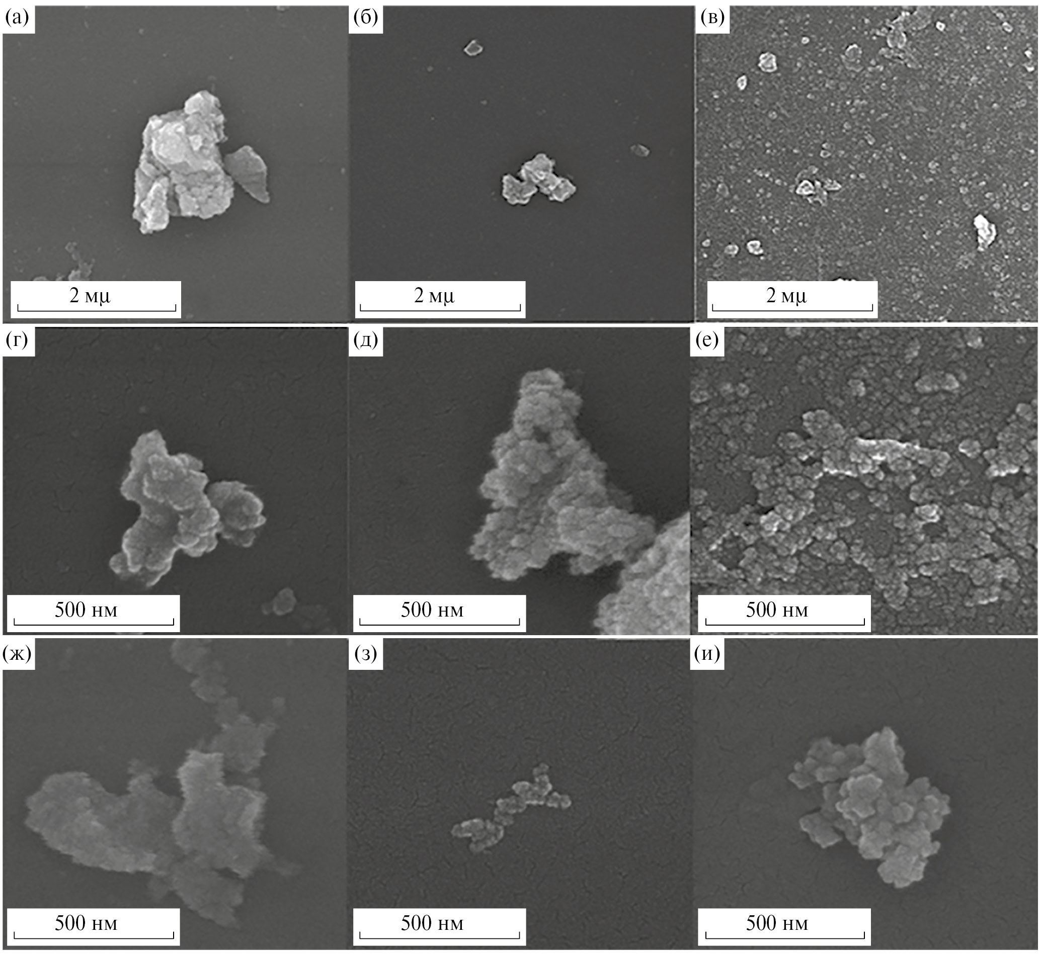 Рис. 1. Изображения, полученные сканирующей электронной микроскопией: НЧ СеО₂ после этапа просушки при 80 °С в течение 2.5 ч (а–в), в течении 16 ч при 120 °С (г–e) или в течение 2 ч при 600 °С (ж–и): (а, г, ж) быстрый впрыск NH₄OH в водный раствор нитрата церия; (б, д, з) медленное добавление NH₄OH в водный раствор нитрата церия; (в, е, и) одновременное медленное добавления NH₄OH и нитрата церия.