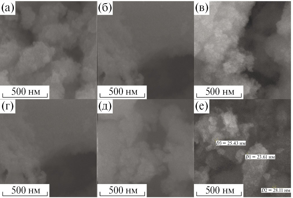 Рис. 4. СЭМ-изображения НЧ СеО₂, полученных осаждением при одновременном введении растворов нитрата церия и аммиака без ультразвукового воздействия (а–в) и с ультразвуковой обработкой (г–е) и с последующей сушкой при 80 °С (а, г); при лиофильной сушке (б, д); при сушке потоком воздуха (в, е).