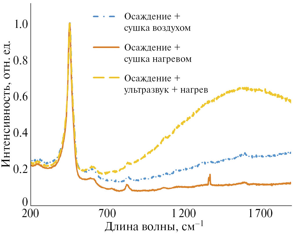 Для детального исследования влияния условий сушки на характеристики НЧ СеО₂ образцы, полученные при различных вариантах смешивания, делили на две части и подвергли сушке либо в течение 16 ч при температуре 120 °C в сушильном шкафу, либо в течение 2 ч при температуре 600 °C в муфельной печи. Полученные образцы ресуспендировали в фосфатносолевом буфере и помещали в ультразвуковую ванну на 15 мин.