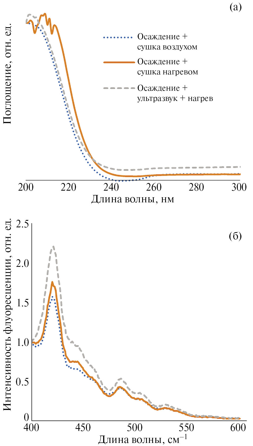 Из данных комбинационного рассеяния видно (рис. 5), что образцы, полученные осаждением с сушкой потоком воздуха и нагреванием, обладают схожими полосами в спектрах. Увеличение интенсивности сигналов в длинноволновой части спектра, вероятнее всего, связано с наложением флуоресценции наночастиц СеО₂, что подтверждается спектрами поглощения и флуоресценции. Изменение в нанокристалле кислородной стехиометрии и образование ионов Ce3+ вызовет изменение оптических и люминесцентных свойств НЧ оксида церия. При ультразвуковом воздействии на осажденный образец происходит увелечение интенсивности в длинноволновой области, при этом характер полос флюорита с подповерхностными кислородными вакансиями не изменяется (полосы при 462 и 623 см-1). Спектры поглощения и флуоресценции представлены на рис. 6.