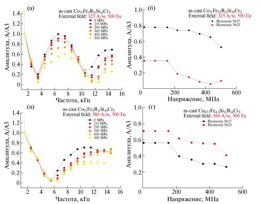 Для первого состава механические напряжения, превышающие некоторый предел (порядка 350 МПа), приводят к трансформации магнитной анизотропии, что обусловлено зависимостью константы магнитострикции от напряжений. При этом наблюдается резкое изменение гармонического спектра.
