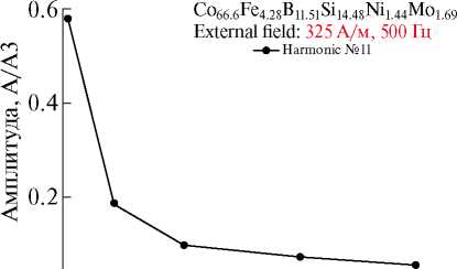 Видно, что амплитуды гармоник изменяются немонотонно с увеличением их номера, что характерно для наклонной петли гистерезиса с выходом на насыщение.