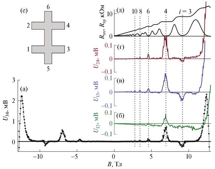 Рис. 2. Зависимости напряжения, регистрируемого на разных парах потенциальных контактов, от магнитного поля при T = 4.2K (а–г); зависимости продольного (Rxx) и холловского (Rxy) сопротивлений от магнитного поля, пунктирные линии проведены через центры плато квантового эффекта Холла (д); схематичный вид холловского мостика. 1–4 – потенциальные контакты, 5–6 – токовые контакты (е).