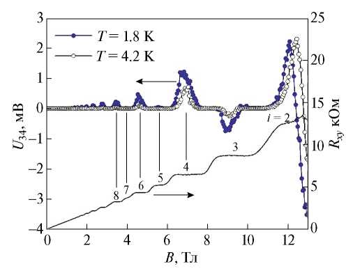 Рис. 3. Зависимости напряжения на потенциальных контактах 3–4 от магнитного поля при температурах 4.2 K (серая кривая, незакрашенные символы) и 1.8 К (синяя кривая, закрашенные символы). Черной жирной линией обозначено холловское сопротивление при T=4.2 K (правая ось). Цифрами указаны номера плато КЭХ.