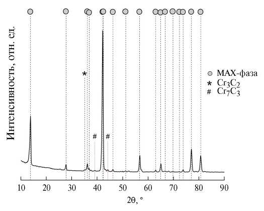 На рис. 2 приведен спектр рентгеновской дифракции порошка (Cr0.75Mn0.25)2AlC после очистки в соляной кислоте. На спектре хорошо видно, что практически все линии принадлежат отражению от MAX-фазы. Период решетки MAX-фазы отличается от периодов не допированных марганцем Cr2AlC, линии сдвинуты в сторону больших углов. Незначительное количество карбидов хрома Cr3C2 и Cr7C3 также присутствует в образце после очистки в соляной кислоте.