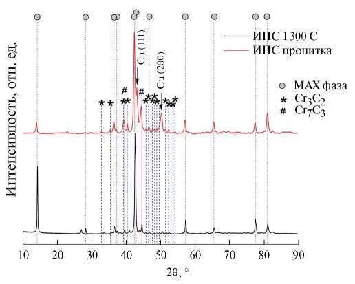 На рис. 3 представлены рентгенограммы от образца порошка после искрового плазменного спекания и взаимодействия с расплавом меди. На рентгенограмме образца после спекания видно, что изменения фазового состояния образца не происходит, и MAX-фаза остается основной фазой. Тем не менее, в результате нагрева образца при искровом плазменном спекании происходит незначительное увеличение доли фазы Cr7C3, интенсивность её пиков растет. При взаимодействии спеченного образца с медью на рентгенограмме появляются линии твердого раствора на основе меди, отмечены на рентгенограмме. Увеличивается интенсивность линий карбида Cr7C3. Линии MAX-фазы также присутствуют на рентгенограмме, но они смещаются в область меньших углов.