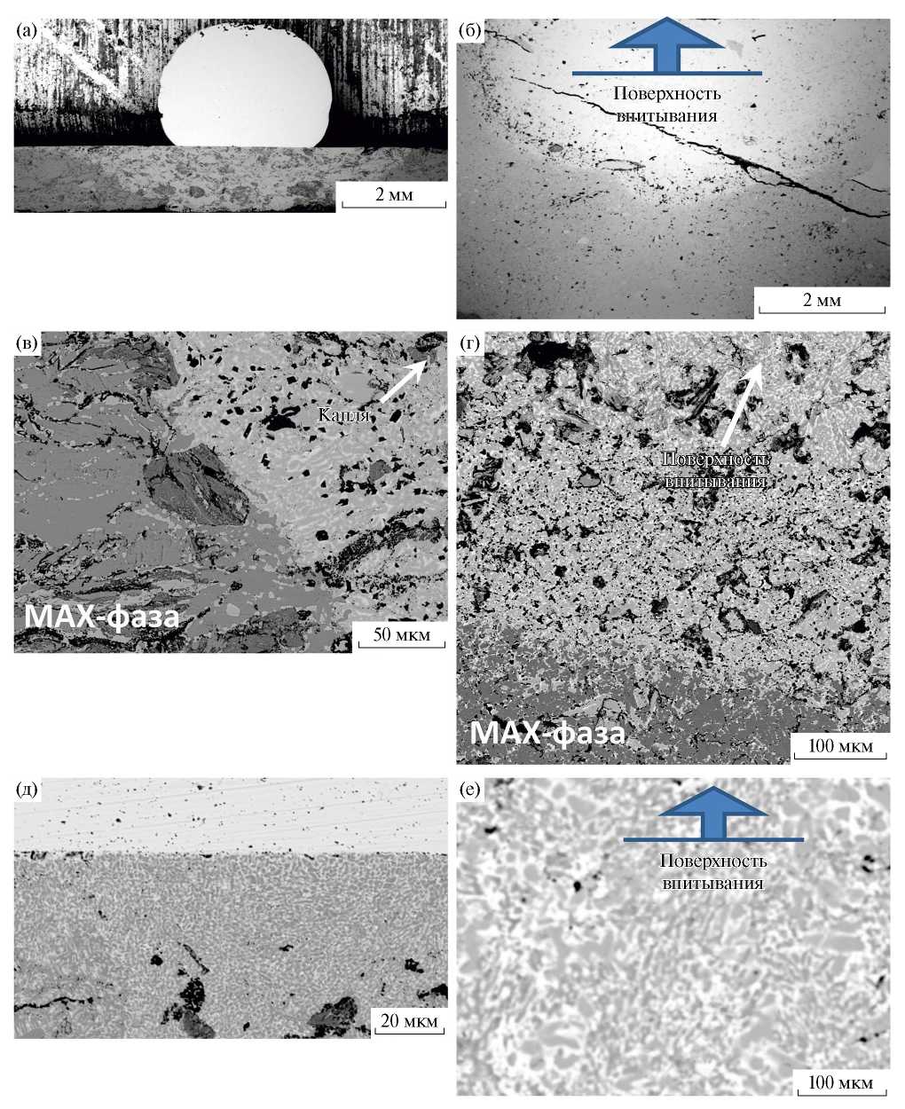 Рис. 4. Электронно-микроскопические изображения поперечных шлифов спеченного, плотного образца (Cr0.75Mn0.25)2AlC под каплей меди (а, в, д) и пропитанной медью пористой подложки (б, г, е). а – капля меди и область изменения состава под ней (светлее в сравнении с областью МАХ-фазы); б – область, пропитанная медью (светлая). Впитавшаяся капля находилась непосредственно над верхним краем изображения; в, г – переходная область распавшейся и сохранившейся МАХ-фазы на плотном и пористом образцах соответственно; д, е – микроструктура области, непосредственно контактировавшей с медной каплей (для плотного и пористого образцов соответственно).