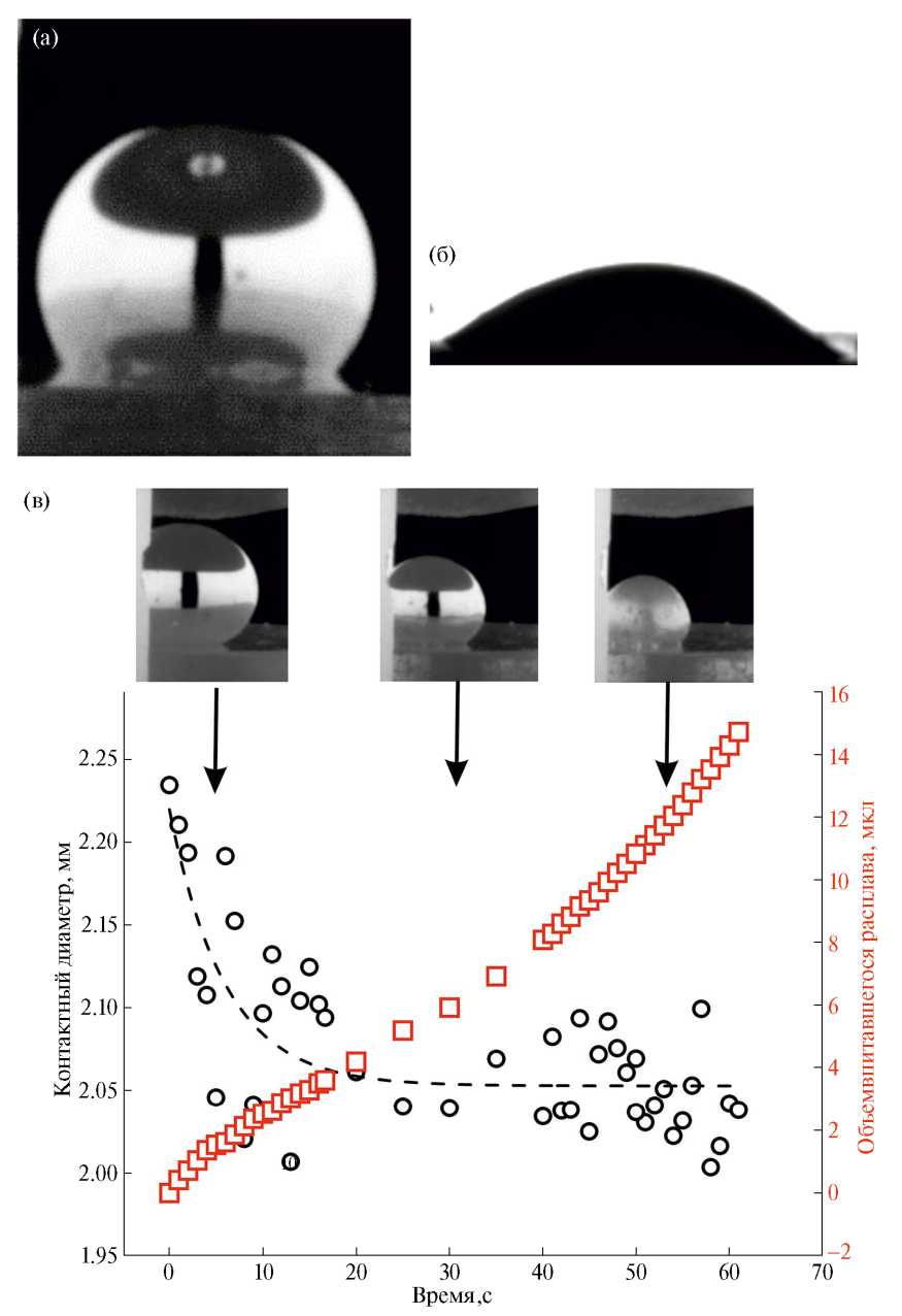 Рис. 7. Капли расплавов меди на поверхности плотных, спеченных МАХ-фаз (Cr0.75Mn0.25)2AlC (а) и Cr2AlC (б). Кинетика впитывания расплава меди в пористую фазу (Cr0.75Mn0.25)2AlC и изображения капель в процессе впитывания, а также контактный диаметр капли в процессе впитывания (в).