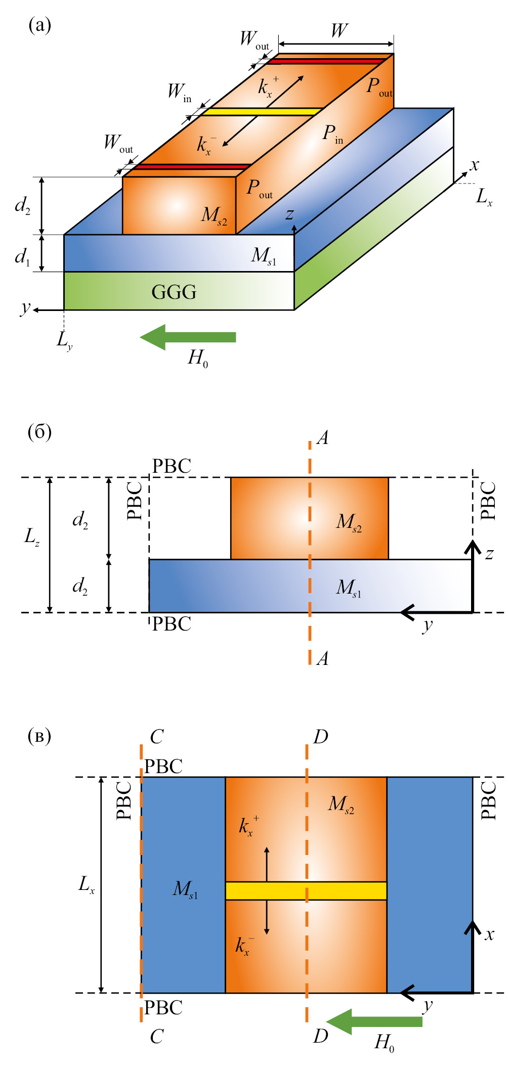 Рис. 1. Схематическое изображение исследуемой структуры, состоящий из двух пленок ЖИГ (а); поперечное сечение структуры в плоскости (y, z) (б); вид сверху на структуру в плоскости (x, y) (в). Желтым цветом выделена область возбуждения при численном эксперименте. Красным цветом выделены области выходных антенн. Ориентация внешнего магнитного поля H0 показана стрелкой на рисунке. Используемые обозначения даны в тексте