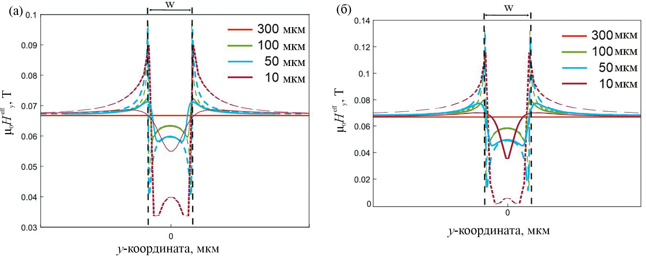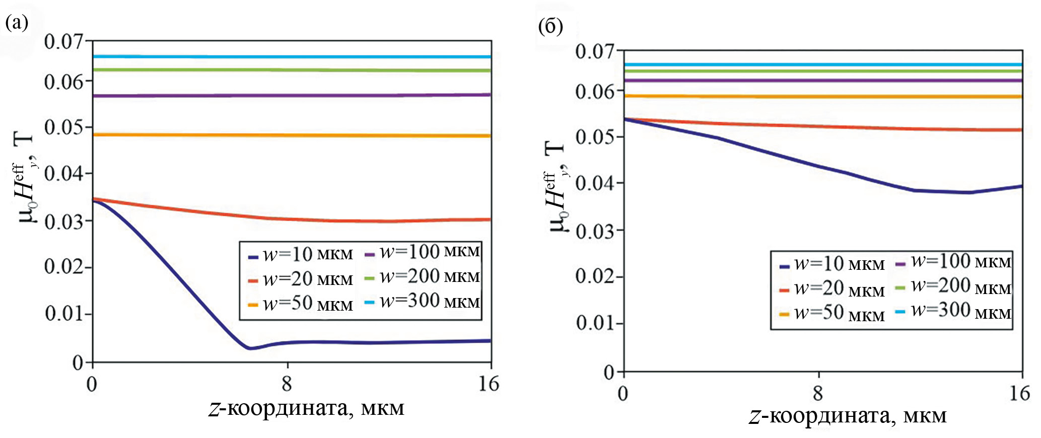 Рис. 2. Распределение (z) в сечении y = Ly/2 в зависимости от ширины волновода w: a) LS-структура, б) HS-структура