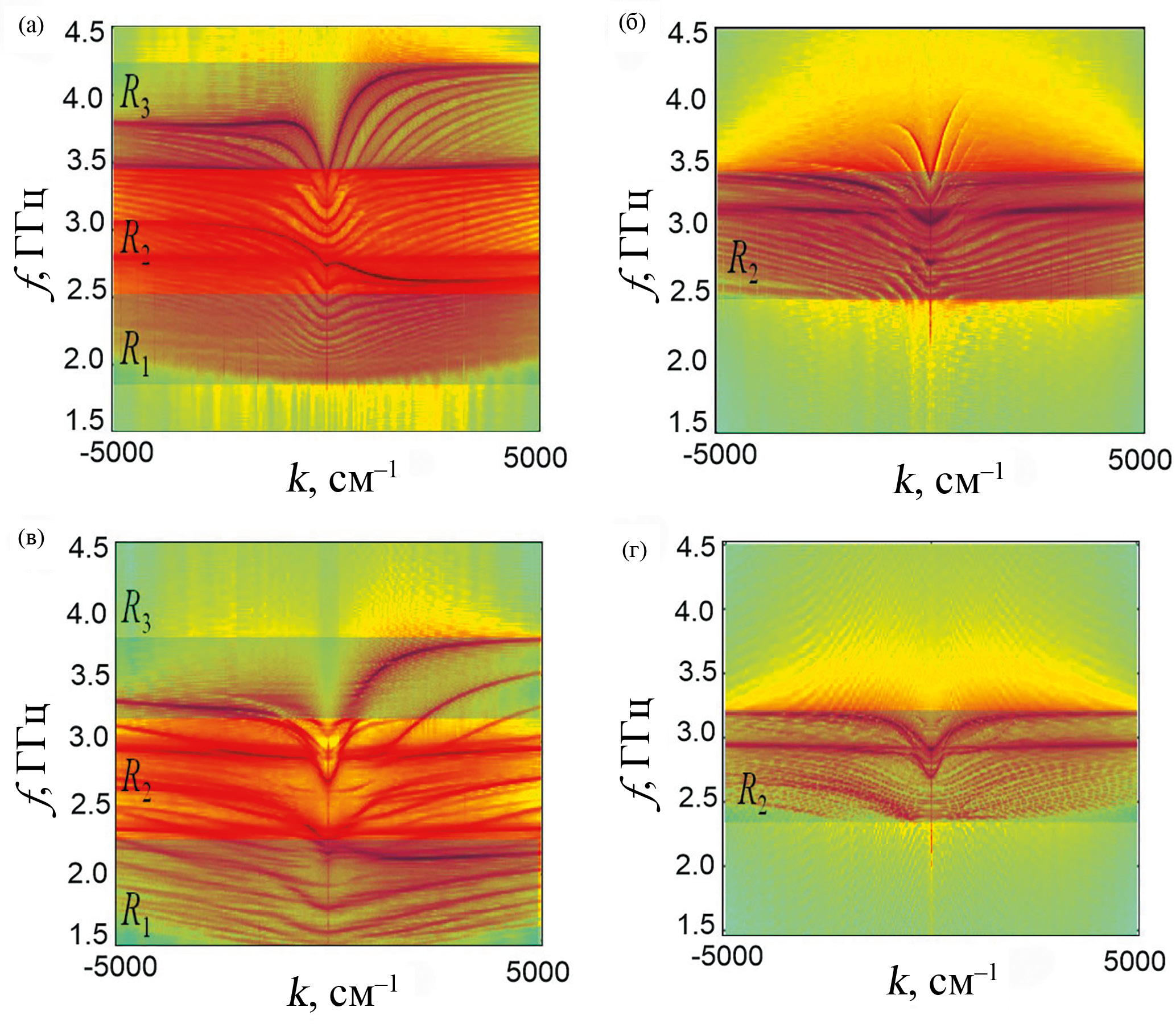 В силу ограниченных поперечных размеров боковых волноводов спектр волн также будет дискретным и включать в себя ветви ширинных мод. Однако в боковых волноводах могут распространяться и вытекающие моды центрального волновода. Регион R2 на рис. 5a и рис. 5б отмечает частотную область перекрытия дисперсионных характеристик волн центрального и боковых волноводов. Таким образом, регион R2 рис. 5б включает в себя направляемые моды боковых и вытекающих мод центрального волновода. В регионах R1 и R3 находятся только направляемые моды центрального волновода, а в регионе R2 как направляемые, так и вытекающие в боковые волноводы моды спиновых волн. С точки зрения практического применения наибольший интерес представляют направляемые моды центрального волновода, поэтому ограничимся анализом волн только такого типа.
