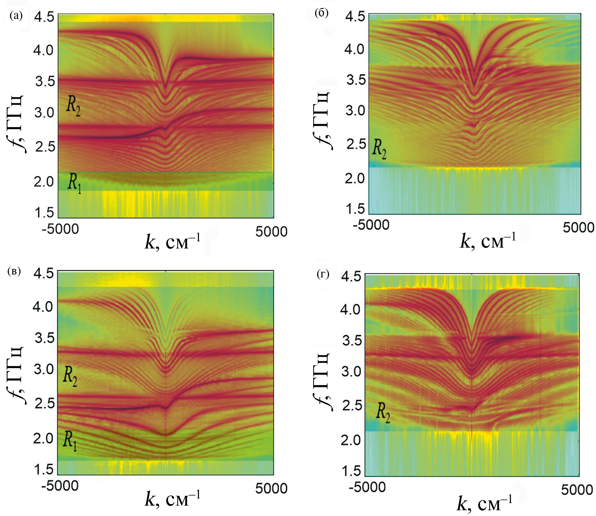 Расчеты показали, что существуют две низкочастотные ветви (с, d) с началом спектра (k = 0) на частоте fp1 и две высокочастотные ветви (a, b) с началом спектра на частоте fp2 (рис. 4). Как и в “референсной” структуре, внутреннее поле однородно и равно внешнему так как , а частоты fp1, fp2 являются частотами поперечного ФМР и приближенно определяются формулами Киттеля: