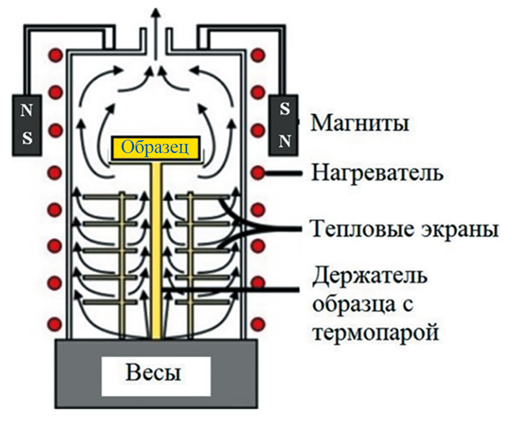 Данные о характере протекания фазового перехода в области температуры Кюри получены методом термомагнитометрии (ТММ), проведенной на синхронном термическом анализаторе Netzsch STA 449C Jupiter. Данный вид термического анализа представляет собой термогравиметрию в постоянном магнитном поле и активно применяется при исследовании магнитных фазовых переходов в ферро- и ферримагнитных соединениях [17, 21–25]. Устройство экспериментальной ячейки для проведения ТММ показано на рис. 1.