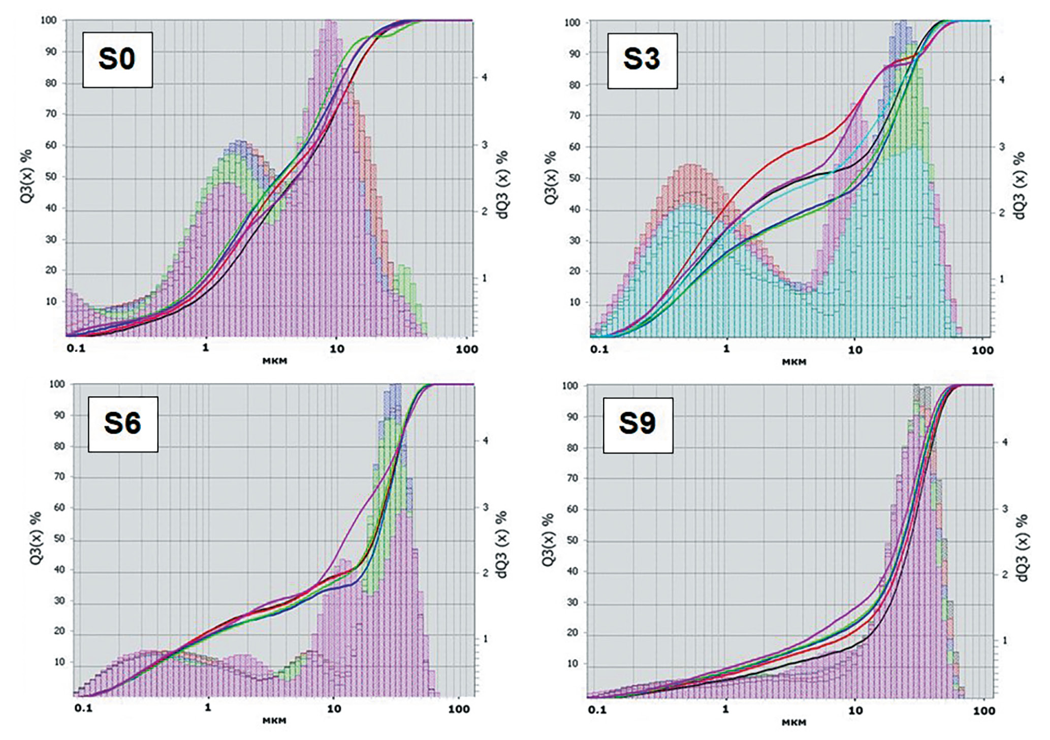 На рис. 5 приведены распределения в интегральной и дифференциальной форме для исходного образца, а также образцов S3, S6, S9. Картины распределения сформированы на основе шести независимых измерений по каждому образцу НЦФ (каждой итерации присвоен собственный цвет).