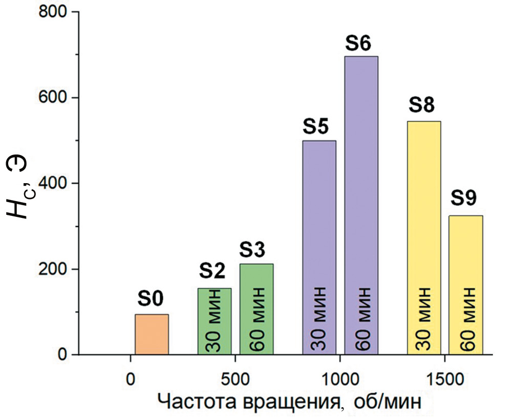 Закономерность изменения коэрцитивной силы от режимов измельчения (рис. 8) имеет схожий вид с закономерностями, полученными для удельной площади поверхности образцов. Показано, что данный параметр уменьшается с увеличением среднего размера частиц. Этот феномен действительно характерен для мультидоменных частиц: их коэрцитивная сила увеличивается до т.н. критического размера, при котором они начинают проявлять суперпарамагнитные свойства [28].