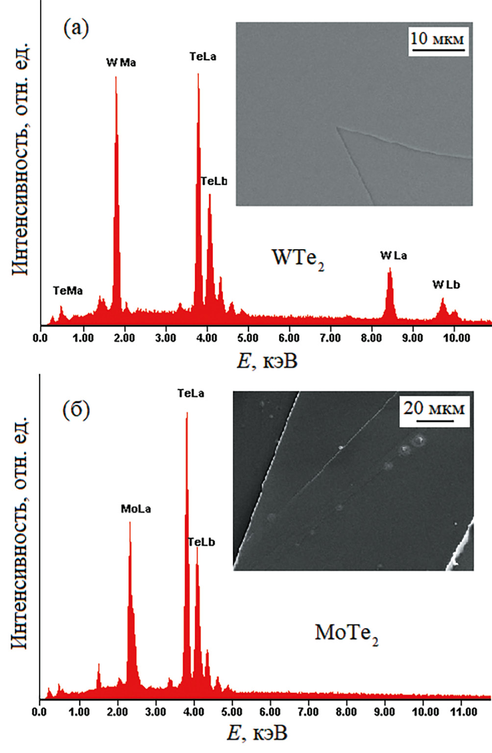 Химический состав монокристаллов исследован методом рентгеновского энергодисперсионного микроанализа на сканирующем электронном микроскопе FEI Quanta 200 Pegasus с приставкой EDAX в Центре коллективного пользования (ЦКП) “Испытательный центр нанотехнологий и перспективных материалов” ИФМ УрО РАН. Установлено, что химический состав полученных образцов соответствует стехиометрическим WTe2 и MoTe2 (рис. 2).