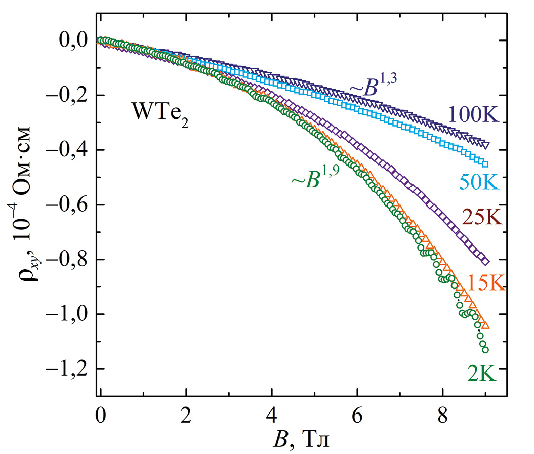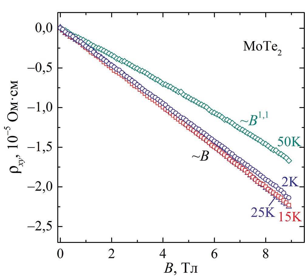 Для подтверждения того, что нелинейная полевая зависимость сопротивления Холла монокристалла WTe2 связана с рассеянием на поверхности, также можно было бы измерить зависимости ρxy(B) для более “грязного” кристалла. Однако в данной работе исследовали монокристалл WTe2 с отношением сопротивлений ρ300 К/ρ4,2 К ≈ 55, но не удалось получить образцы другой степени чистоты. В то же время монокристалл MoTe2, который является электронным аналогом WTe2, имеет меньшее отношение сопротивлений ρ300 К/ρ4,2 К ≈ 15. Предполагается, что это приведет к увеличению линейного вклада в холловское сопротивление монокристалла MoTe2.