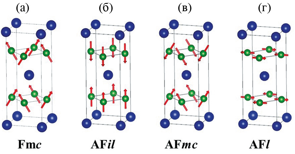 Соединение LaMn2Si2 при T<310 K имеет скошенную ферромагнитную структуру с ферромагнитной компонентой вдоль оси с и антиферромагнитной компонентой в базисной плоскости – “ferromagnetic canted”, Fmc, согласно терминологии, введенной в работе [11] (рис. 1a). В интервале температур от 310 до 460 K в этом соединении реализуется антиферромагнитная слоистая структура, “antiferromagnetic layered”, AFl (рис. 1г) [12]. В соединении YMn2Si2 ниже температуры Нееля TN = 510–515 K все атомы Mn в слое упорядочены ферромагнитно коллинеарно вдоль с-оси, в то время как магнитные моменты соседних слоев Mn ориентированы в противоположные стороны. Такая структура получила название “antiferromagnetic interplane layered”, AFil (рис. 1б). В области промежуточных составов при значениях x от 0.2 до 0.4 обнаружена антиферромагнитная структура “antiferromagnetic canted”, AFmc, с антиферромагнитными компонентами как вдоль с-оси, так и в базисной плоскости (рис. 1в), которая для составов вблизи x = 0.2 сосуществует с ферромагнитной структурой Fmc [13].