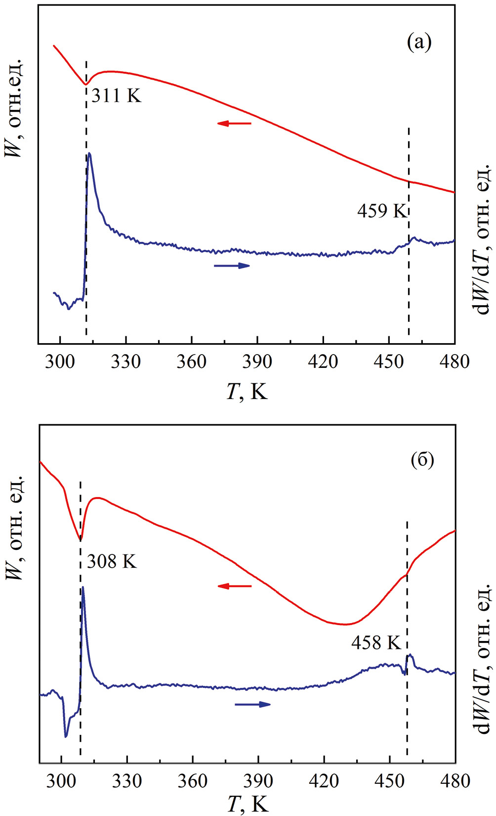 Широкий минимум на кривой W(T) вблизи температуры 430 К (рис. 2б) является приборной базовой линией; он наблюдается на кривой ДСК пустого Pt/Rh тигля и не связан с состоянием образцов. При использовании корундового тигля данная аномалия отсутствует.