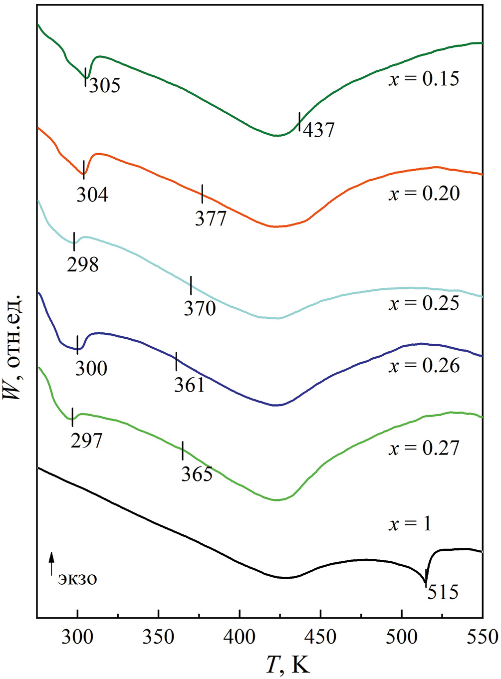 Магнитный фазовый переход антиферромагнетик-парамагнетик для составов с концентрацией иттрия от 0.15 до 0.27 практически не проявляется на зависимостях W(T). Однако на зависимостях первой производной от теплового потока dW/dT(T) можно выделить слабые пики, которые могут быть связаны с тепловыми эффектами при ТN. Положение этих пиков на температурной шкале показано соответствующими отметками на рис. 3. В соединении с x = 0.15 температура Нееля составляет 437 К, и ее значение уменьшается до 363 К с ростом концентрации иттрия в сплаве до x = 0.27.