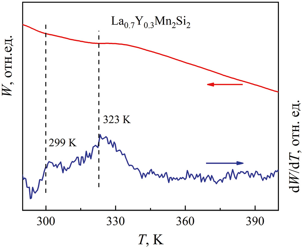 Кривые ДСК и первые производные сигнала ДСК по температуре соединения La0.7Y0.3Mn2Si2 приведены на рис. 4. На зависимости W(T) видны слабые перегибы в области температур 295–330 К. На температурной зависимости первой производной от теплового потока dW/dT(T) эти перегибы проявляются в форме двух пиков, что позволяет выделить две температуры перехода: 299 К и 323 К. Логично было бы пик при 299 К связать с магнитным фазовым переходом между ферромагнитной и антиферромагнитной фазами. Однако данные магнитных измерений [8, 34] однозначно указывают на антиферромагнитное состояние La0.7Y0.3Mn2Si2 во всем температурном интервале магнитного упорядочения. Учитывая данные нейтронной дифракции [20], можно предположить, что пик при 299 К соответствует переходу из фазы AFil в фазу AFl (либо AFmc), а пик при 323 К – переходу из фазы AFl (либо AFmc) в парамагнитную фазу. Для уточнения типа магнитных структур необходимо проведение нейтрон-дифракционного исследования. Следует отметить, что переход между двумя антиферромагнитными фазами ранее не фиксировали в интерметаллидах RMn2X2.