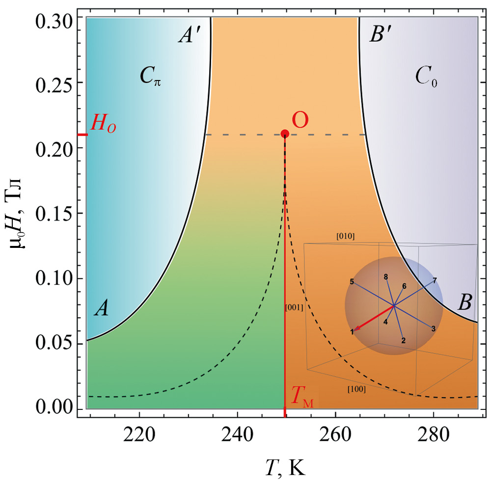 Проанализируем особенности эффективного термодинамического потенциала пленки феррита во внешнем магнитном поле, направленном вдоль легкой оси магнетика. Для моделирования воспользуемся следующими параметрами GdIG: K1 = –7 × 103 эрг/см3, χ⊥ ≈ 1.5 × 10–3, Md = 5μB и Mf(0) = 21μB в расчете на одну молекулу пленки феррит-граната, λMd = 5 × 105 Э. Далее, используя численные методы, построим фазовую H–T-диаграмму GdIG (рис. 1). Для более подробного ознакомления с аналитическим анализом фазовых диаграмм ферримагнитных пленок отсылаем читателей к работам [https://doi.org/10.1016/S1567-2719(05)80008-3, Белов К.П. Звездин А.К., Кадомцева А.М., Летвин Р.З. Ориентационные переходы в редкоземельных магнетиках // Наука, 1979, Гнатченко С.Л. Автореферат кандидатской диссертации // Харьков: ФТИНТ УССР, 1977, A. Zvezdin and V. Matveev, Sov. Phys. JETP 35, 140 (1972).] На данной диаграмме присутствуют две коллинеарные фазы Cπ и C0, где магнитные подрешетки ориентированы антипараллельно, θ = π и θ = 0. Линии AAʹ и BBʹ представляют собой линии фазового перехода второго рода между коллинеарными и неколлинеарными областями диаграммы NC1, NC2 и NC. Каждая из неколлинеарных фаз диаграммы отвечает определенным диапазонам полярного угла: ниже серой штриховой линии существуют две различные неколлинеарные фазы NC1 и NC2, каждая из которых соответствует диапазонам π / 2 < θ1 < π и π < θ2 < π / 2. Для фазы NC (область выше серой штриховой линии) полярный угол лежит в диапазоне 0 < θ < π. В силу симметрии системы легко получить, что каждому полярному углу в областях NC1 и NC2 соответствует 4 различных азимутальных угла. Таким образом, минимуму термодинамического потенциала в неколлинеарных областях соответствуют пары углов для фазы NC1 и для фазы NC2. Вставка на рис. 1 показывает возможные 8 состояний, отвечающих фазам NC1 и NC2, которые пронумерованы от 1 до 8 соответствующим образом: состояния (1, 2, 3, 4) относятся к области NC1, состояния (5, 6, 7, 8) относятся к области NC2. Красная линия TMO является линией фазового перехода первого рода между неколлинеарными фазами NC1 и NC2. Точка TM ≈ 250 К является температурой компенсацией феррита, в то время как точка О есть критическая точка перехода типа пар-жидкость [23]. Области диаграммы, расположенные под черными штриховыми линиями, есть области сосуществования двух неколлинеарных фаз. Записав условие устойчивости коллинеарной фазы в точке компенсации, где m = 0, легко получить, что критическое поле, соответствующее данной точке равно ≈ 0.21 Тл. Приведенный анализ в дальнейшем поможет изучению спиновой динамики в GdIG. Обратим внимание на то, что данное поле получилось существенно ниже, чем экспериментальные значения критических полей для феррит-гранатов [23]. Причиной этому может служить величина χ⊥, определяемая аналитически из описанной модели. В пленках гранатов ее величина может достигать χ⊥ ∼ 10–5, что вызывает увеличение характерных критических полей на несколько порядков. Здесь же можно отметить, что истинная величина данного поля может быть определена как , где Ha есть поле анизотропии, Hex – величина обменного поля. Также отметим, что в рамках работы мы не рассматриваем влияние одноосной анизотропии, которая существенно увеличивает характерные значения критических полей. Однако в данном тексте мы рассматриваем лишь влияние кубической анизотропии и размагничивания системы на спиновую динамику. С учетом всего описанного выше, мы вос