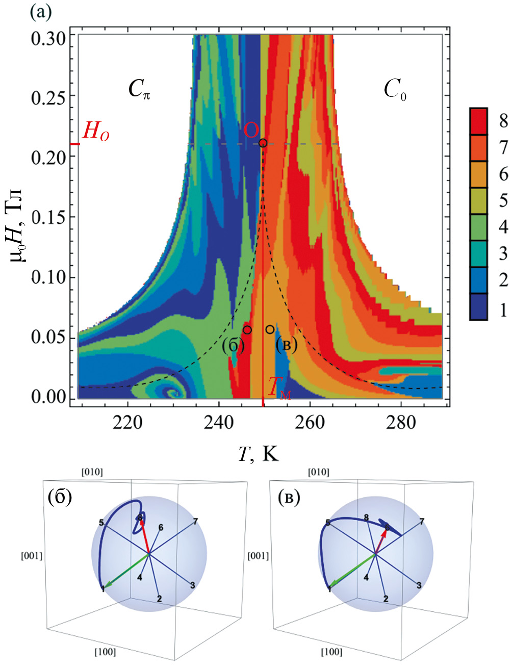 Рис. 1. Фазовая H–T-диаграмма феррит-граната гадолиния GdIG. Внешнее магнитное поле H направлено вдоль оси [001] GdIG. Cπ и C0 представляют коллинеарные фазы феррита, где θ = π и θ = 0. NC1 и NC2 представляют неколлинеарные фазы, отвечающие диапазонам полярного угла π / 2 < θ1 < π и π < θ2 < π / 2, соответственно. TM ≈ 250 К – температура компенсации. Вставка показывает пример стабильных состояний системы в неколлинеарных областях, пронумерованных соответственно от 1 до 8. Состояния (5, 6, 7, 8) относятся к области C0; состояния (1, 2, 3, 4) относятся к области Cπ