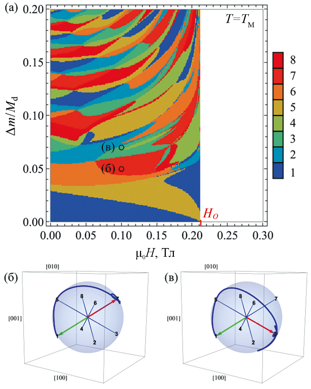 Рис. 3. a – ∆m – H-диаграмма переключения намагниченности при фиксированной температуре ТМ ≈ 250 К; цветом отображается каждое из восьми возможных состояний; б, в – представляют траектории динамики намагниченности для соответствующих точек (б) и (в) на диаграмме (красная и желтая точка, соответственно), зеленая стрелка изображает начальное состояние, красная стрелка – конечное
