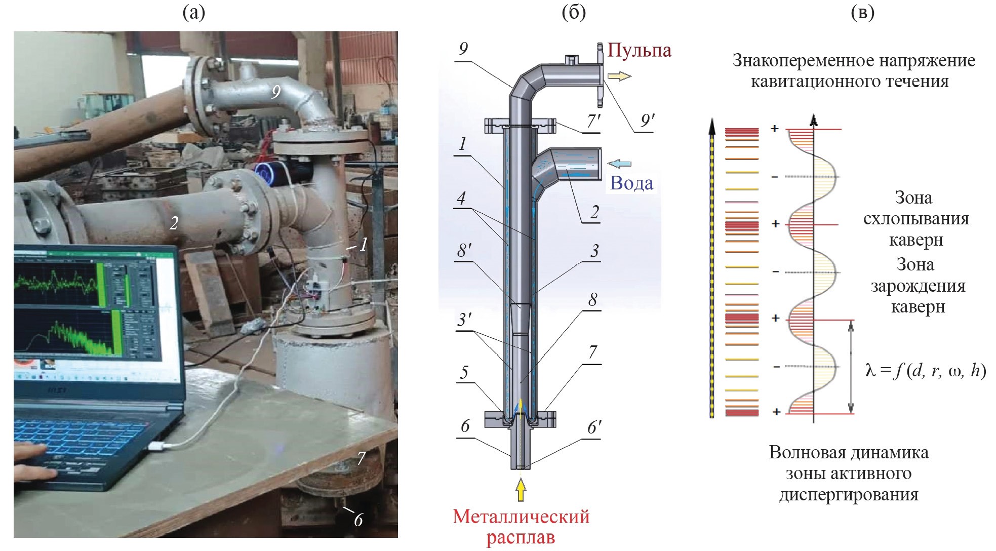 Рис. 1. Общий вид главного технологического узла установки гидровакуумного диспергирования (ГВД) в процессе наладки исследовательского оборудования (а), ее конструкционные особенности (б) и волновая динамика работы (в); 1 – цилиндрический корпус; 2 – водопровод высокого давления; 3 – погруженная в корпус 1 (расположенная концентрично) цилиндрическая труба меньшего диаметра и длины с утолщенными снизу стенками 3´, сужающими ее сечение; 4 – образованный между внешним корпусом 1 и внутренней трубой 3 кольцевой канал (коллектор) для нагнетания подаваемой через канал 2 воды; 5 – полутороидальный конфузор с функцией внутрикорпусной обратной инжекции нагнетённой в кольцевом коллекторе (4) воды, сформированный между нижними торцами корпуса 1 и расположенной внутри него пульпаобразующей трубой Вентури 3-3´, с высотой выходной щели – h; 6 – погружаемая в расплав керамическая насадка с цилиндрическим каналом 6´ и с конусообразной головкой сопряжения к зоне гидравлического разрежения, c условным диаметром – d; 7 – нижняя фланцевая пара для фиксации насадки (6) и герметизации корпуса (1); 7´ – верхняя фланцевая пара/крыша для герметизации водонапорного кольцевого коллектора (4); 8 – диспергационная камера, в которой осуществляется ударно-волновое воздействие λ на всасываемый расплав; 8´ – диффузор образованной пульпы; 9 – коленчатая насадка с ульпаотводящим цилиндрическим каналом 9´ для подачи пульпы к гидроциклонной осадочной камере и к сортирующим, и сушильным установкам (на схеме не показано).